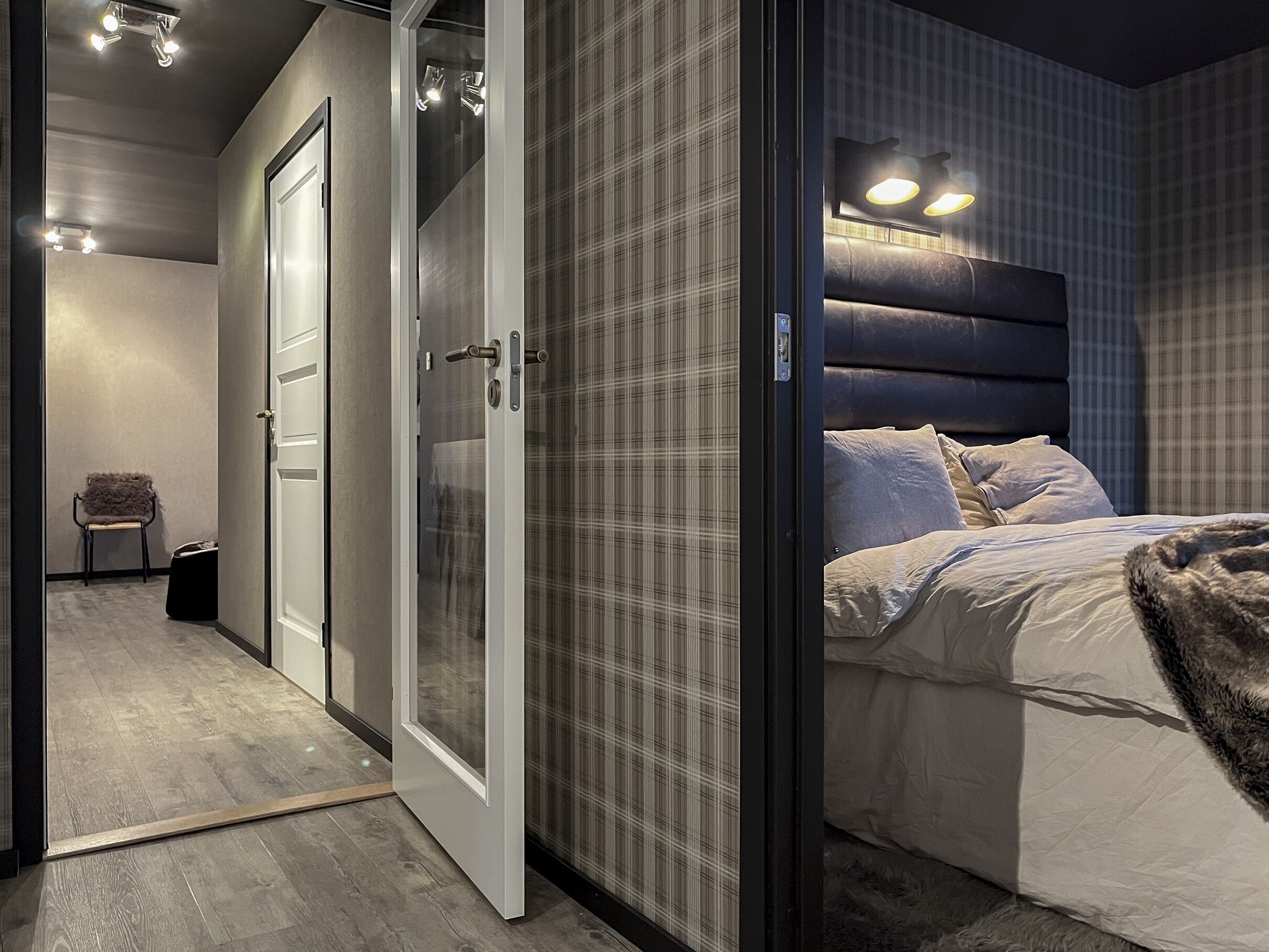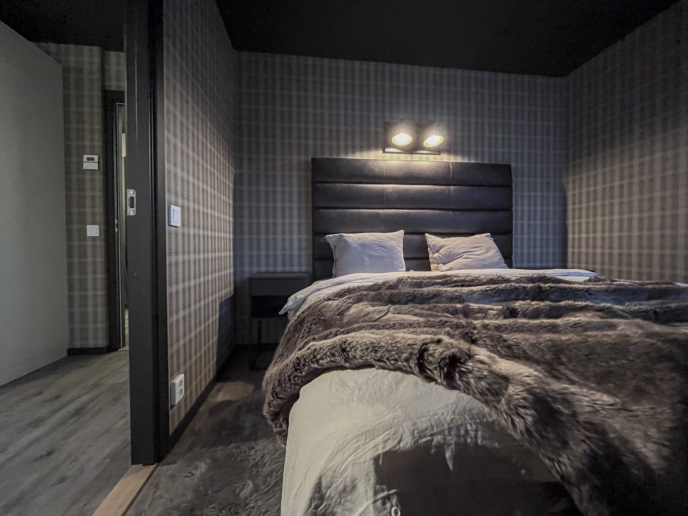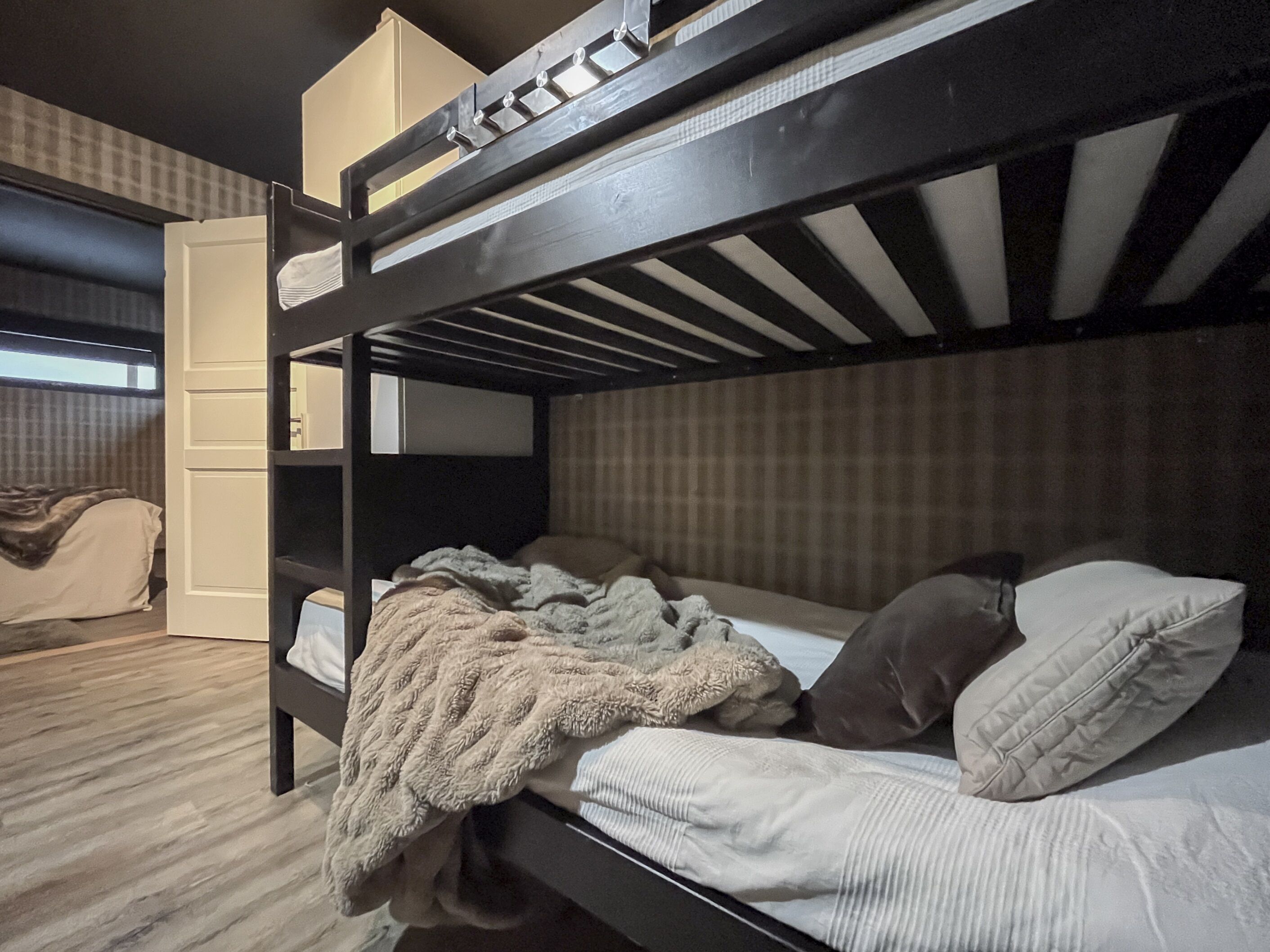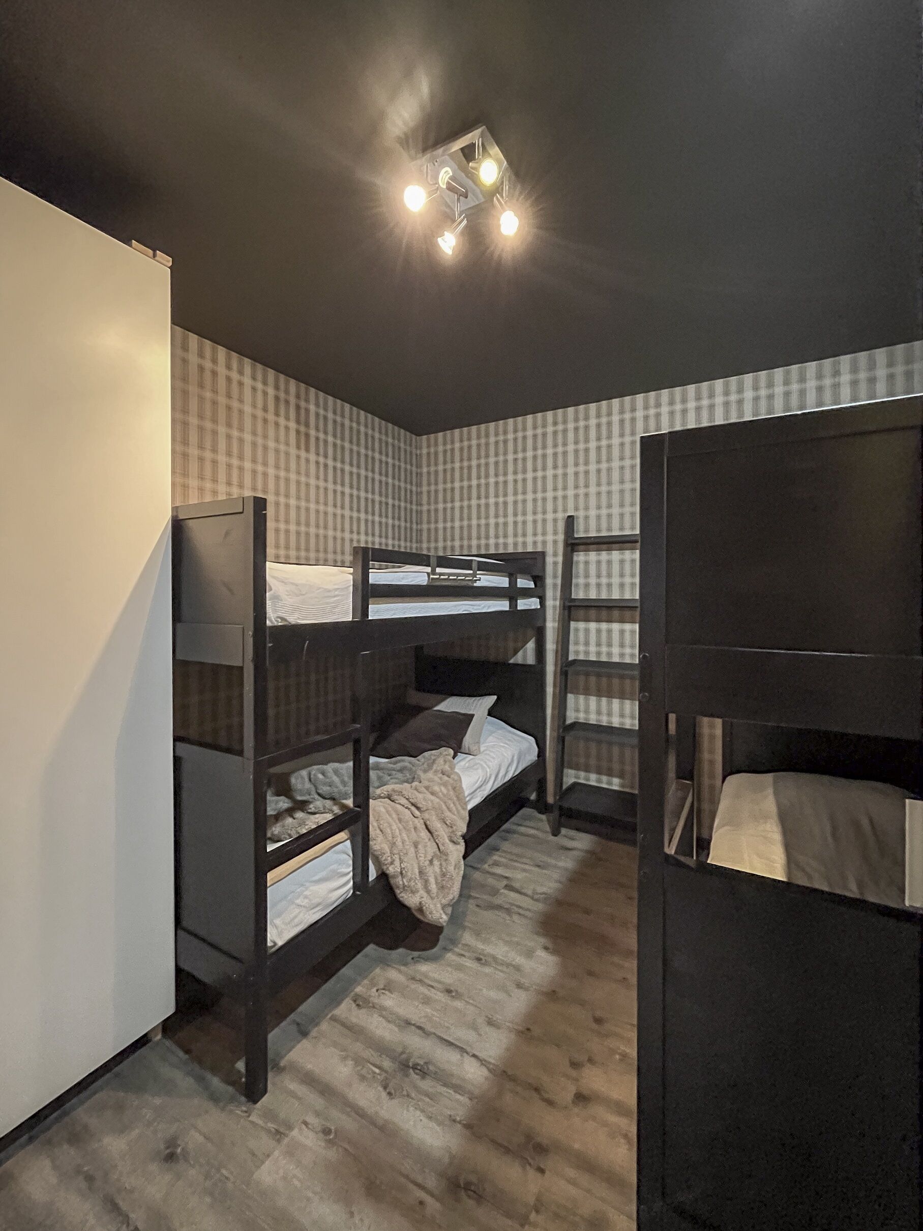 Sypialnie W obiekcie znajdują się cztery sypialnie. Dwa pokoje mają łóżka podwójne, a dwa łóżka piętrowe. Jedna sypialnia nie posiada drzwi. Trzy pokoje są na dolnym poziomie, czwarty na poziomie wejścia.