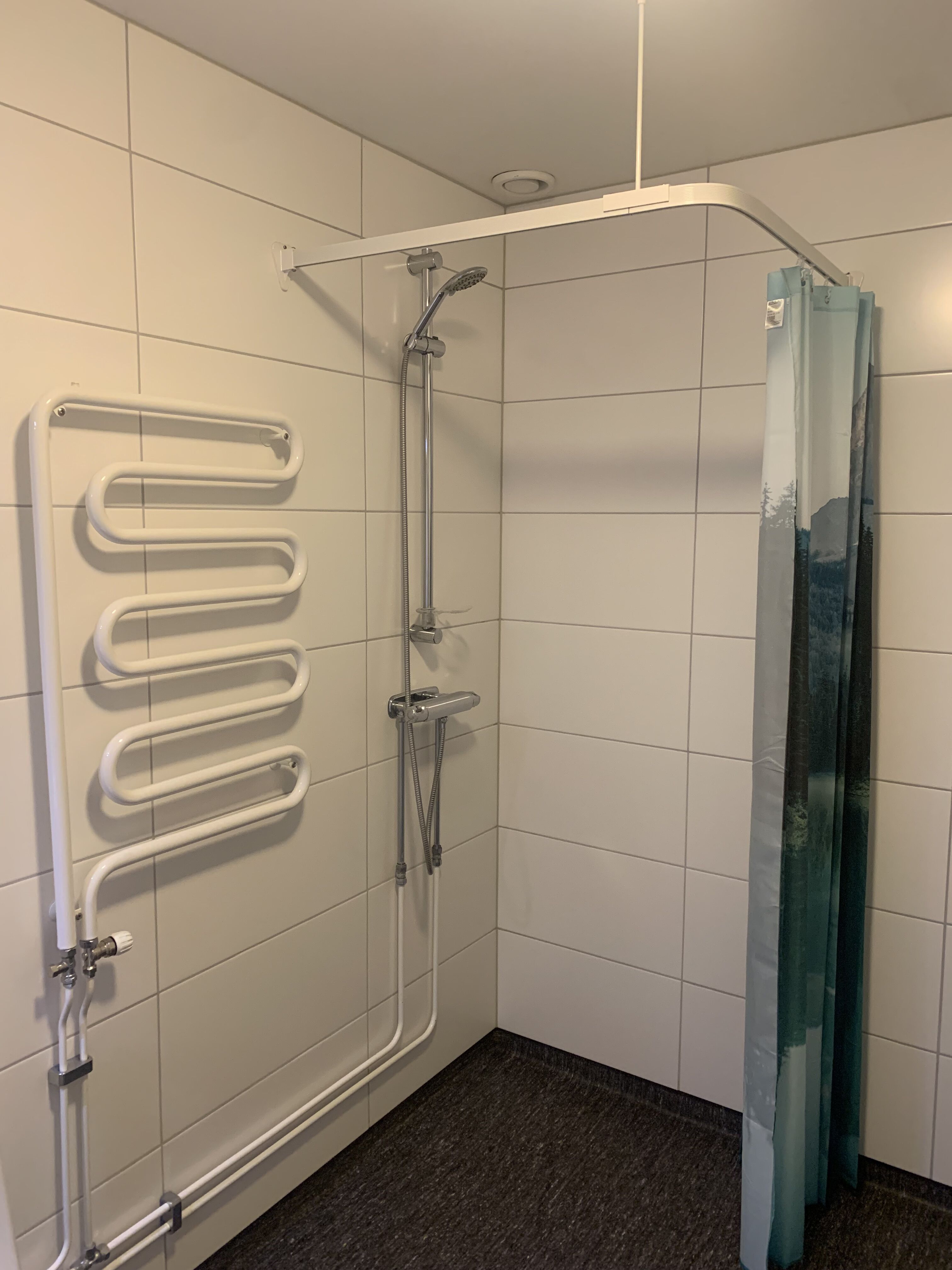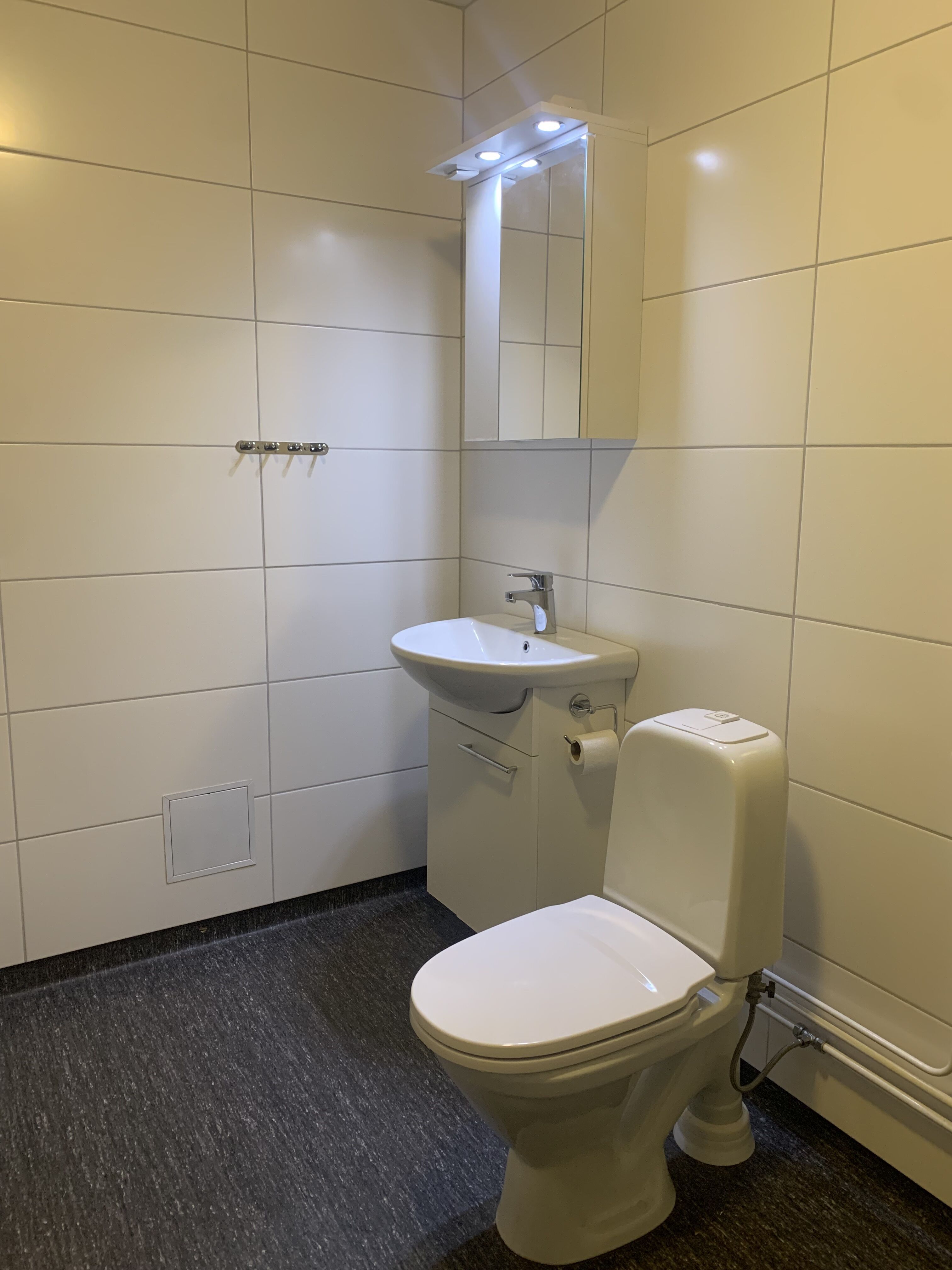 Łazienka Łazienka jest wyposażona w WC, umywalkę oraz prysznic.