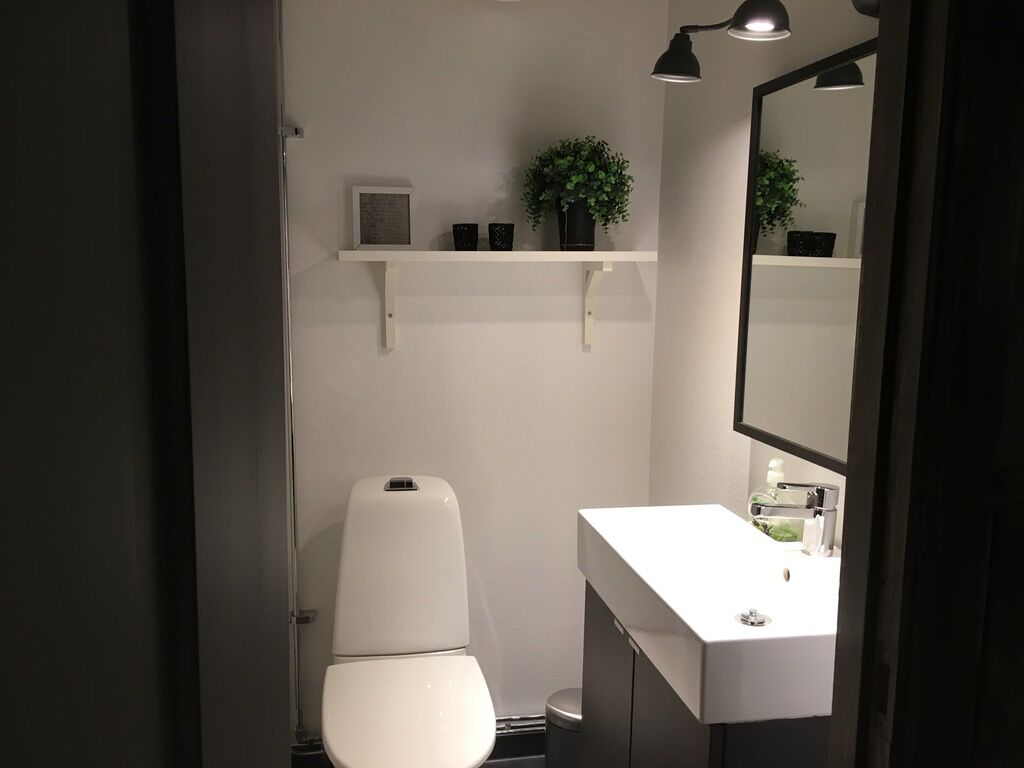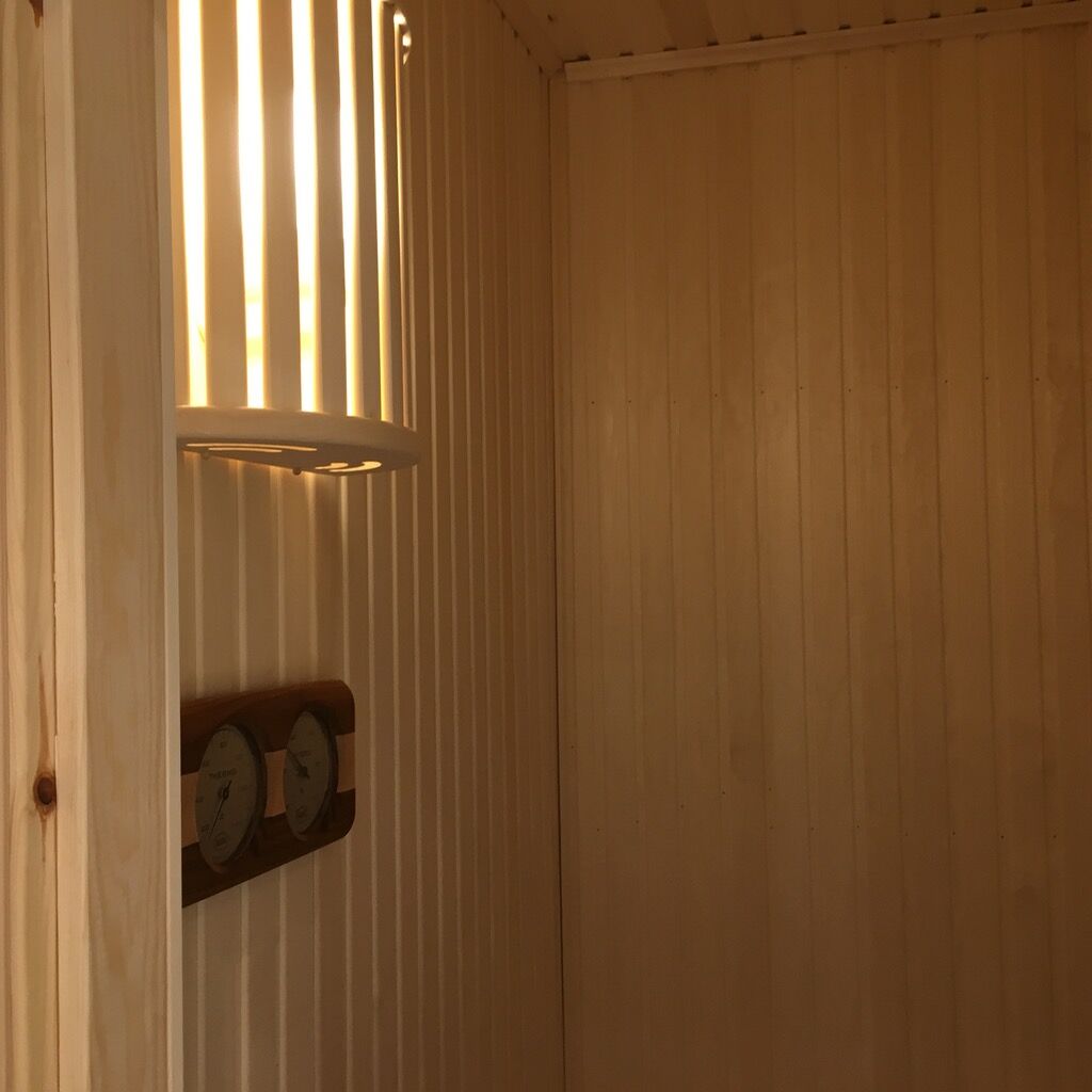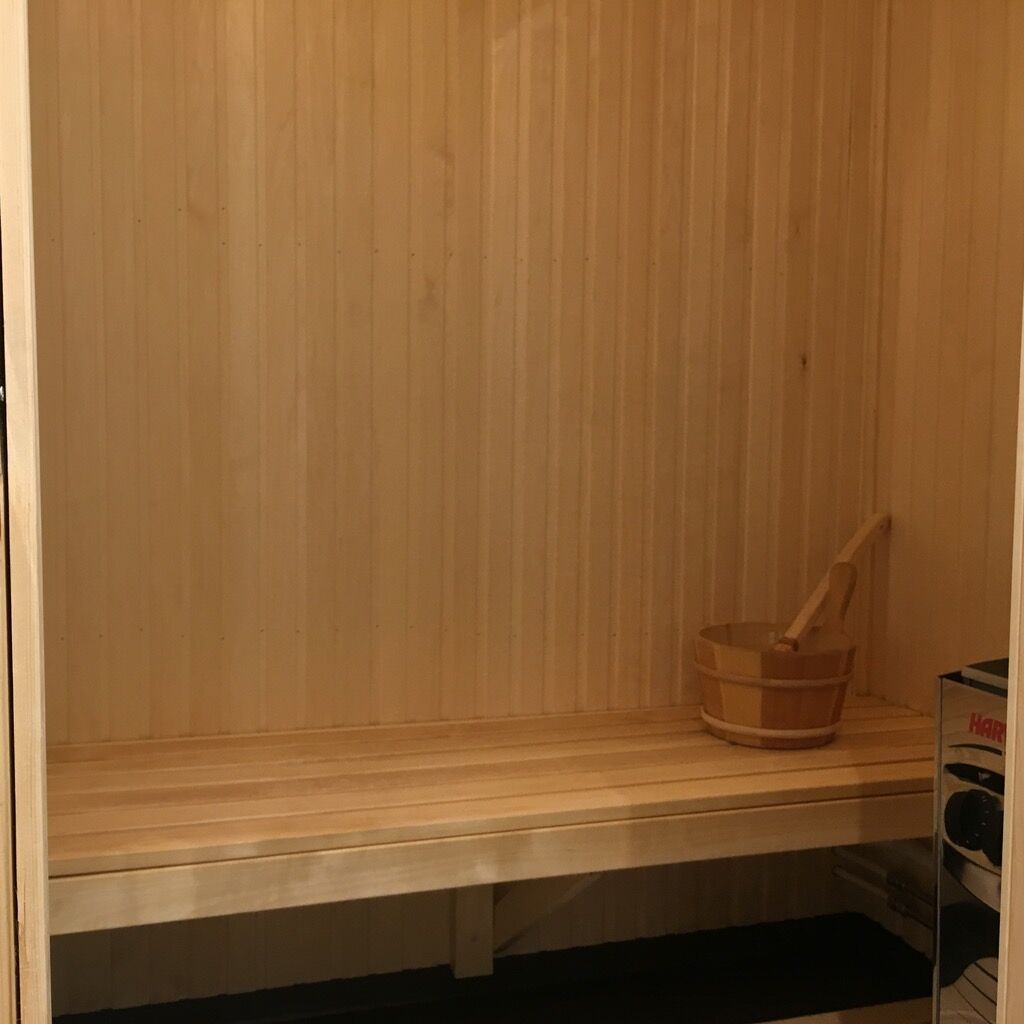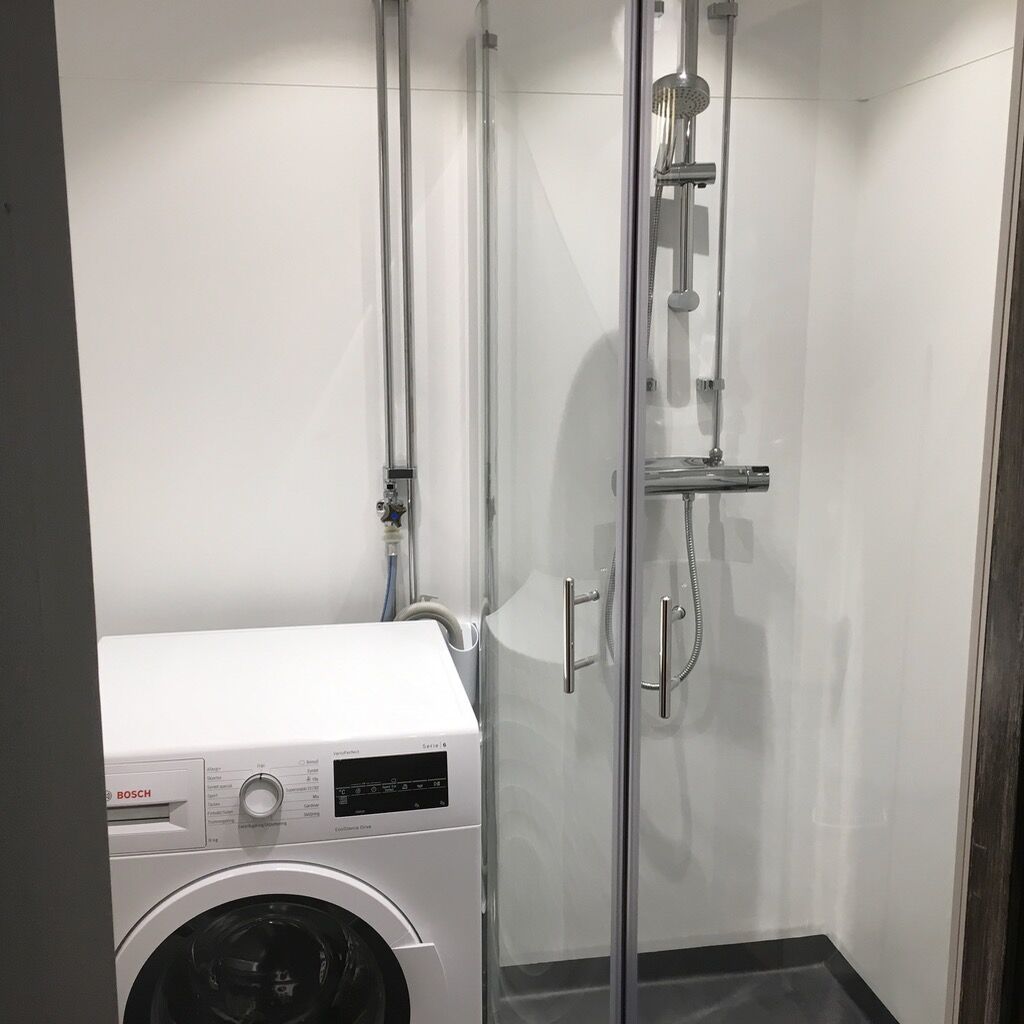 Łazienka jest wyposażona w WC, prysznic, pralkę oraz saunę.