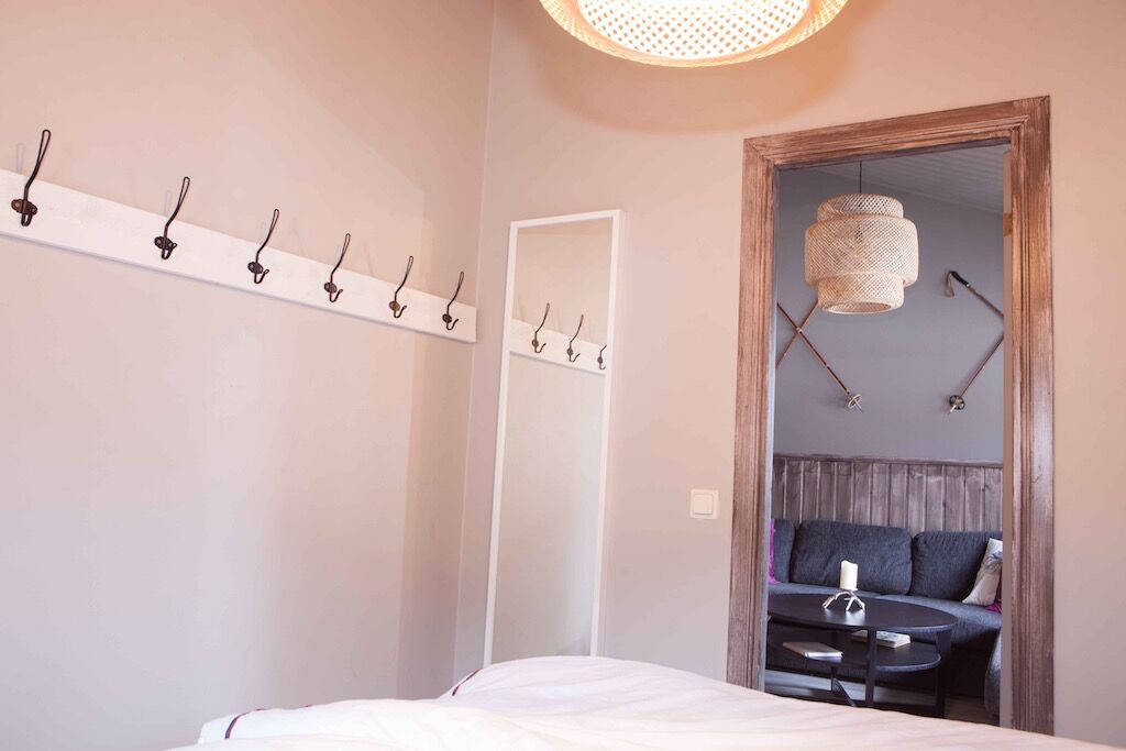 Urocze drewniane domki z czterema apartamentami w każdym budynku. Zakwaterowanie ma 65 m² i oferuje 8 miejsc do spania, rozłożonych na dwie sypialnie i antresolę. W kuchnio-salonie znajduje się stół jadalny, sofa, stolik kawowy oraz telewizor. Łazienka wyposażona jest w WC, prysznic oraz saunę.