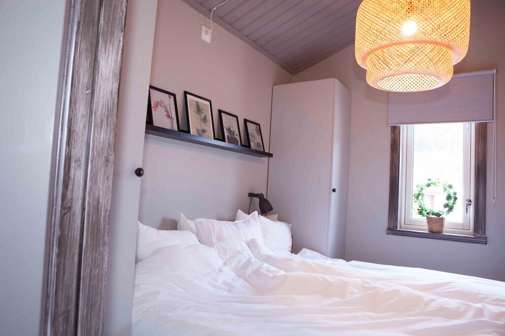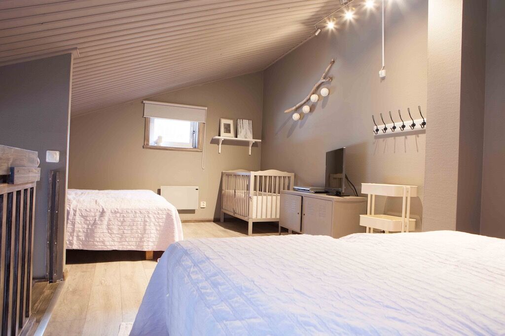 W zakwaterowaniu znajdują się dwie sypialnie na dolnym piętrze, jedna z łóżkiem podwójnym, a druga z łóżkiem piętrowym. Schody na antresolę, gdzie znajdują się cztery łóżka pojedyncze.
