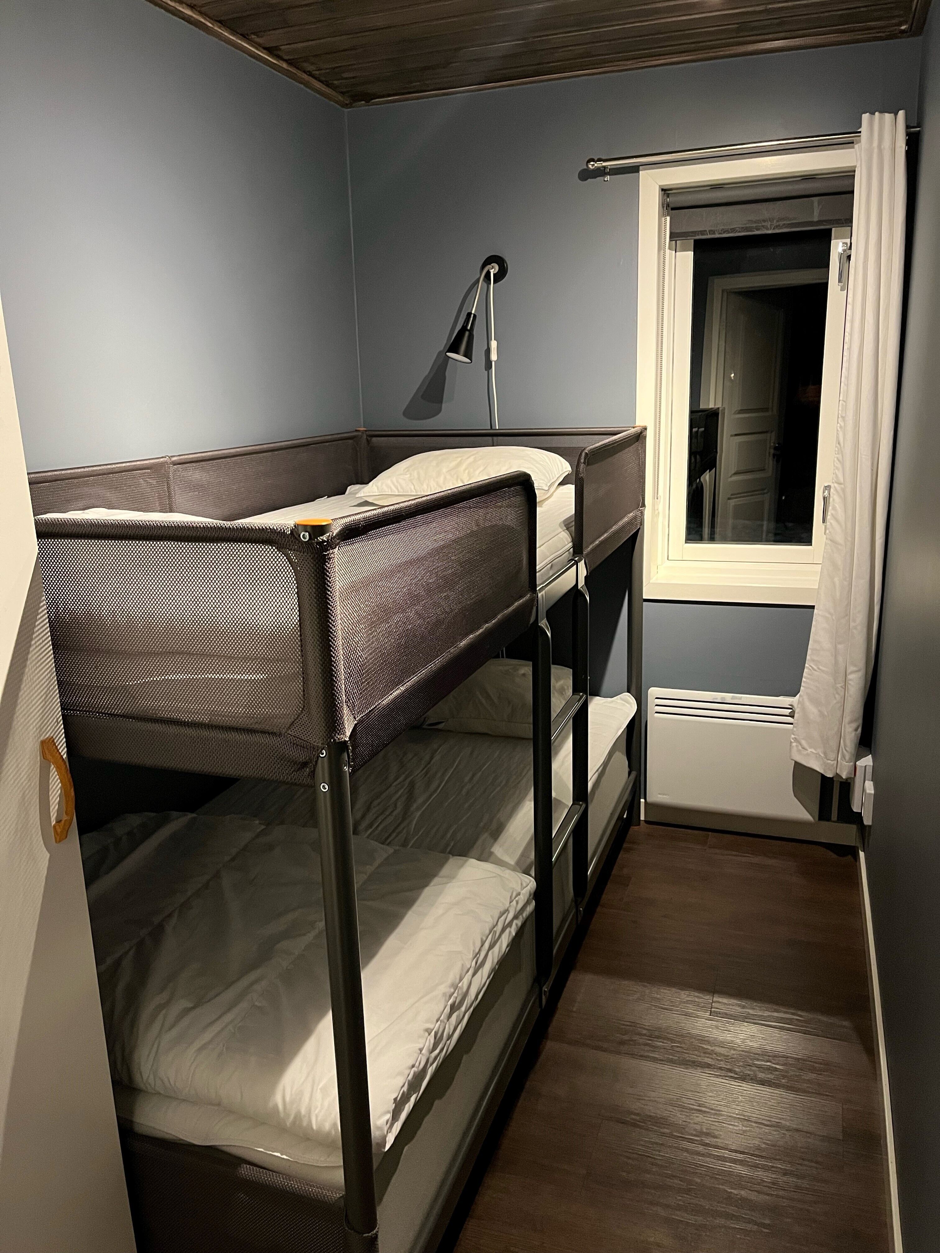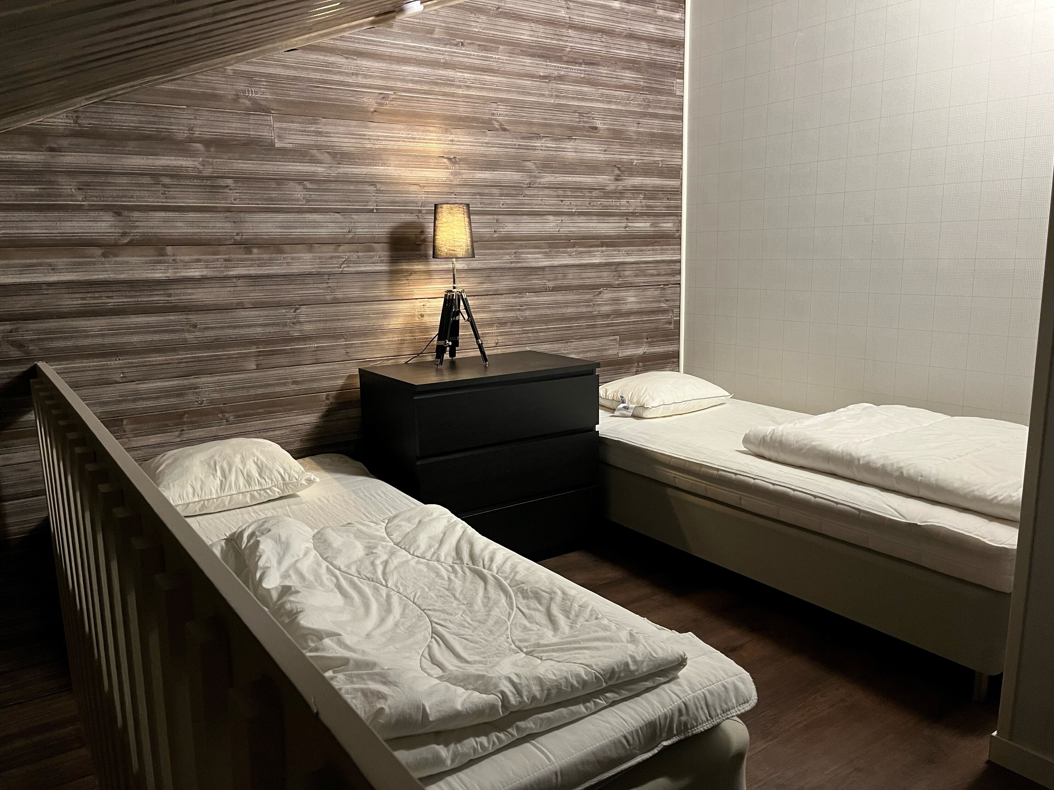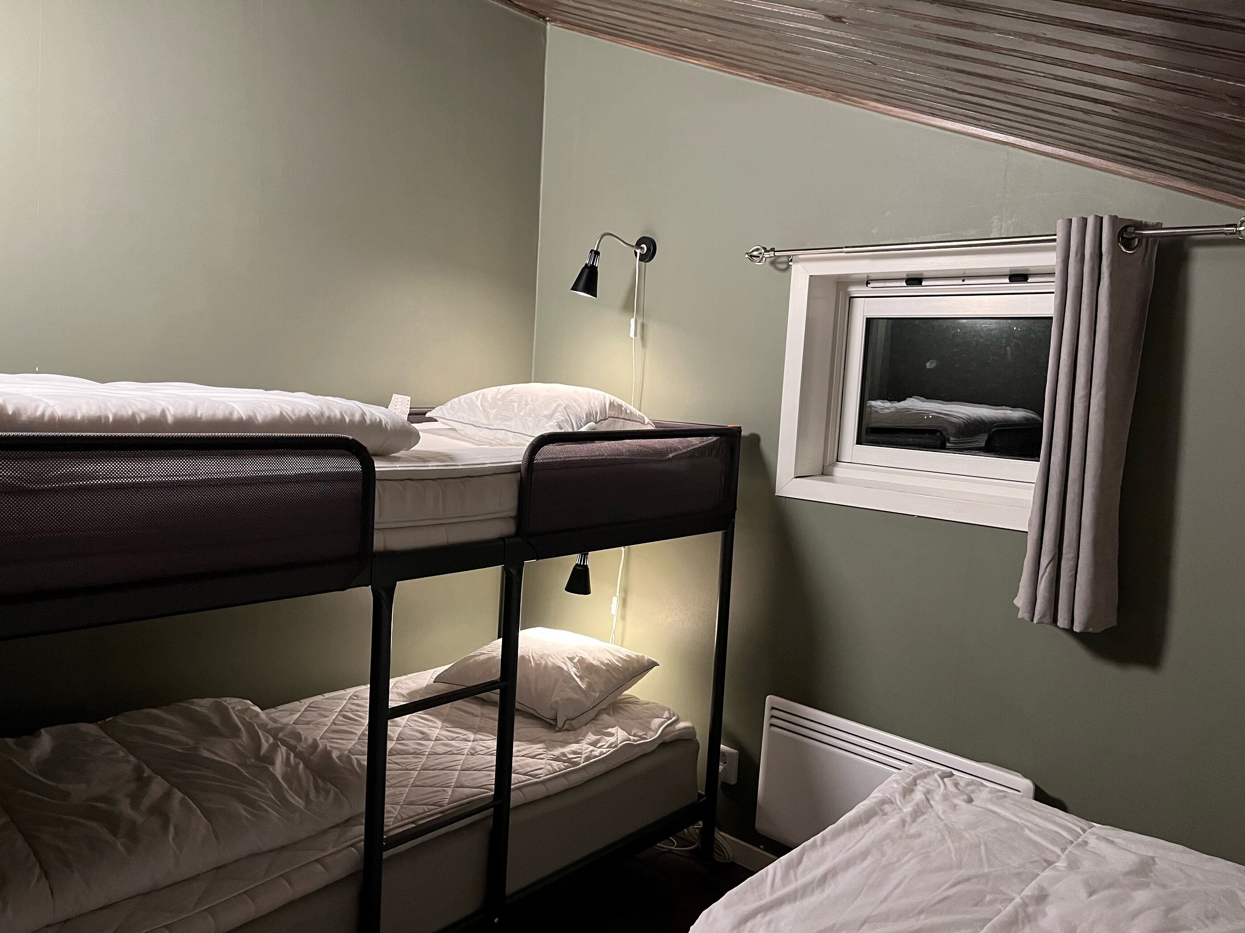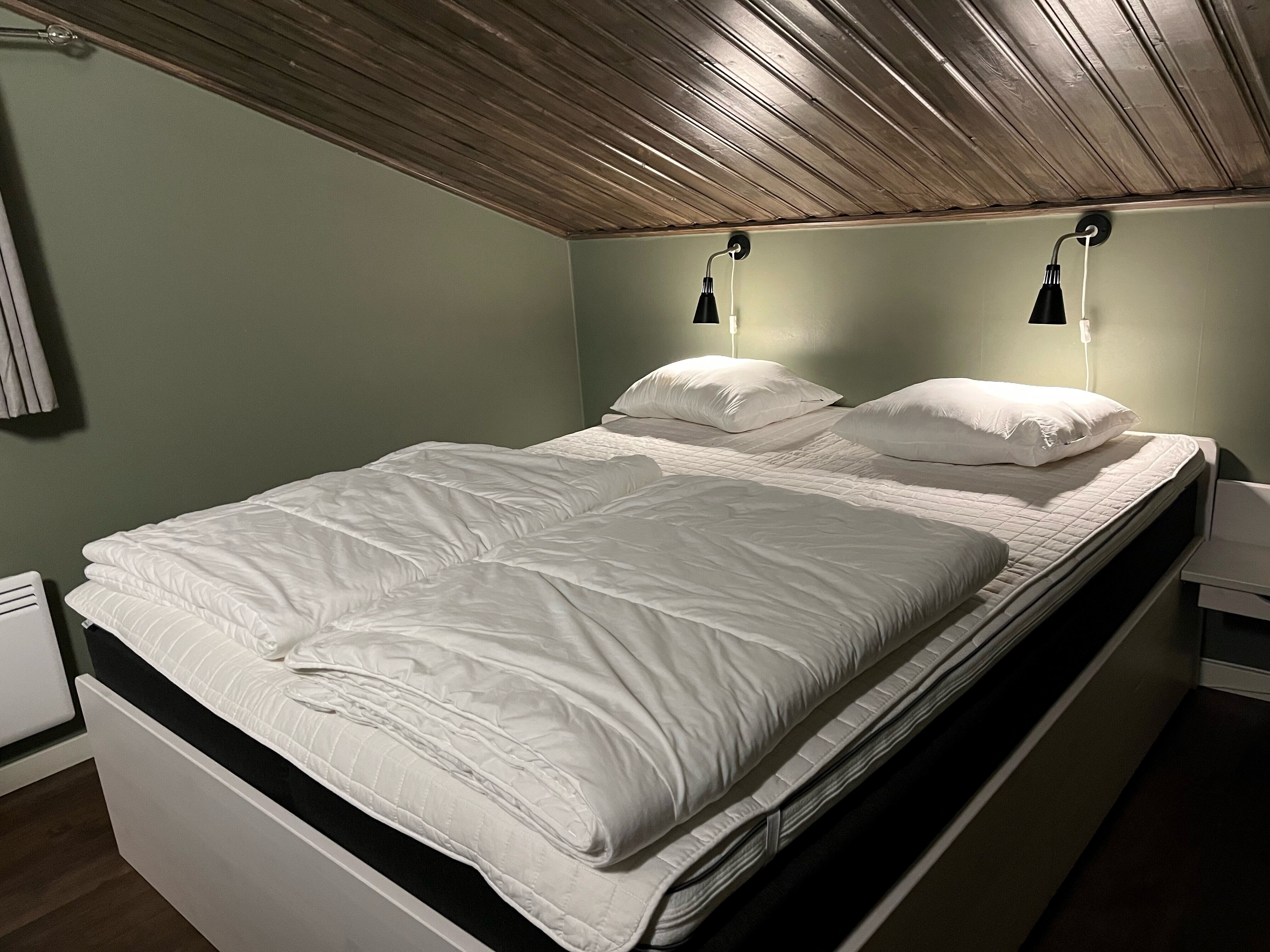 Na dolnym piętrze znajdują się dwie sypialnie: jedna z podwójnym łóżkiem, druga z łóżkiem piętrowym. Na poddaszu znajdują się dwa pojedyncze łóżka oraz sypialnia z podwójnym łóżkiem i łóżkiem piętrowym.