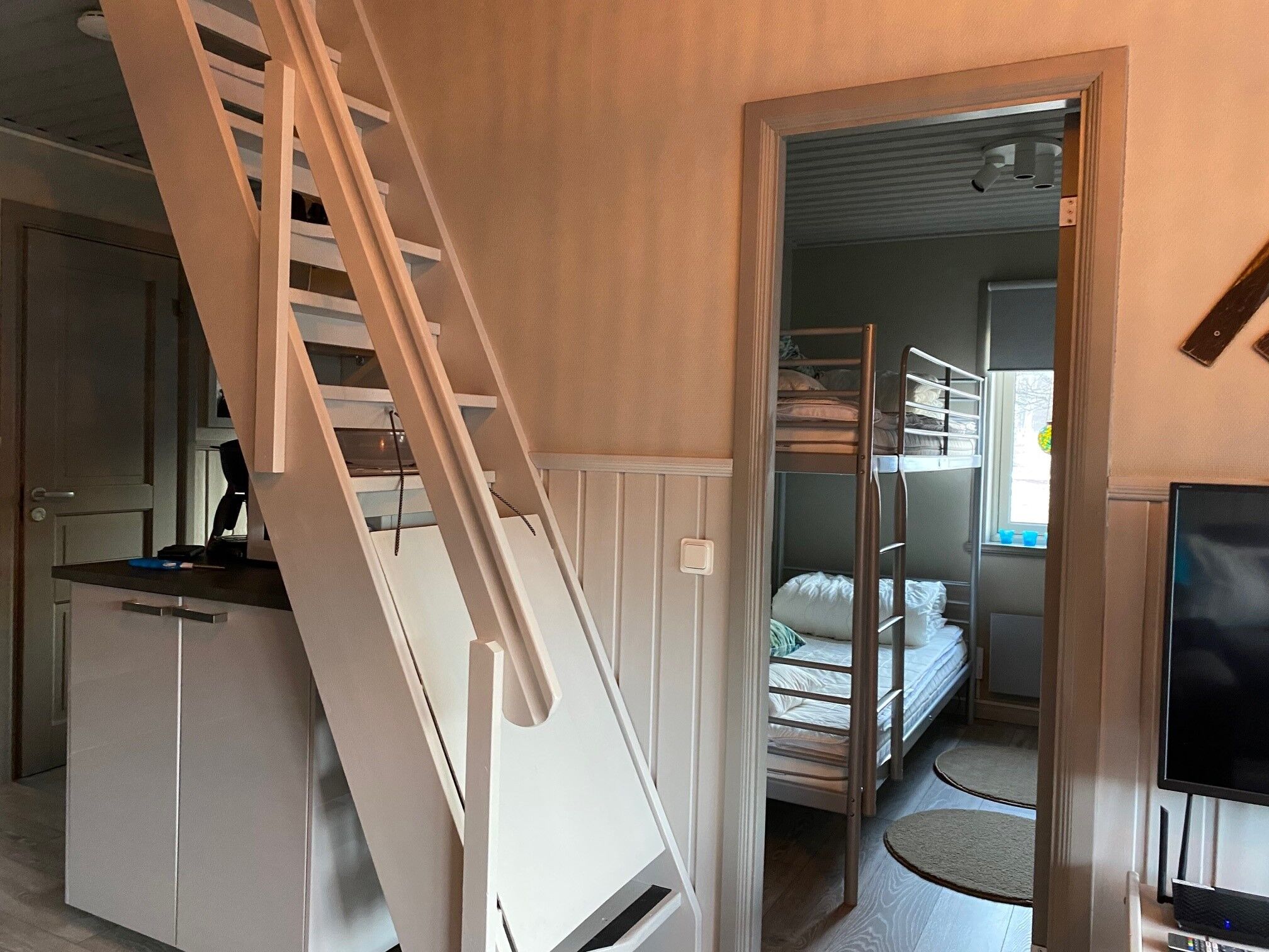 W willi znajdują się dwie sypialnie na dole: jedna z łóżkiem dwuosobowym i jedna z łóżkiem piętrowym. Schody prowadzą na poddasze, gdzie znajduje się sypialnia z łóżkiem dwuosobowym oraz na otwartym poddaszu także łóżko dwuosobowe.