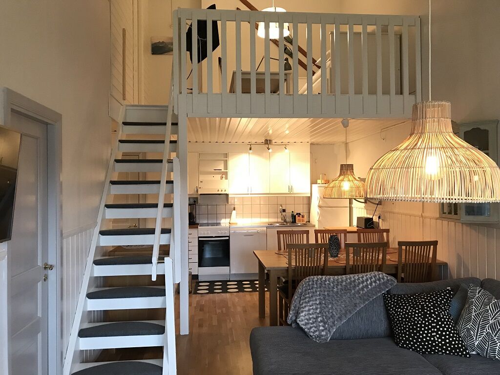 Przytulne drewniane apartamenty z czterema jednostkami w każdym budynku. Mieszkanie ma 65 m² i oferuje 5 miejsc do spania podzielonych na dwie sypialnie na parterze oraz antresolę. Na antresoli znajduje się również rozkładana sofa z dwoma dodatkowymi miejscami do spania. W kuchni/pokoju dziennym znajduje się miejsce do spożywania posiłków, sofa, stolik kawowy oraz telewizor. Łazienka jest wyposażona w WC, prysznic oraz saunę. Te domki zostały starannie odnowione i wszystkie posiadają zmywarkę.