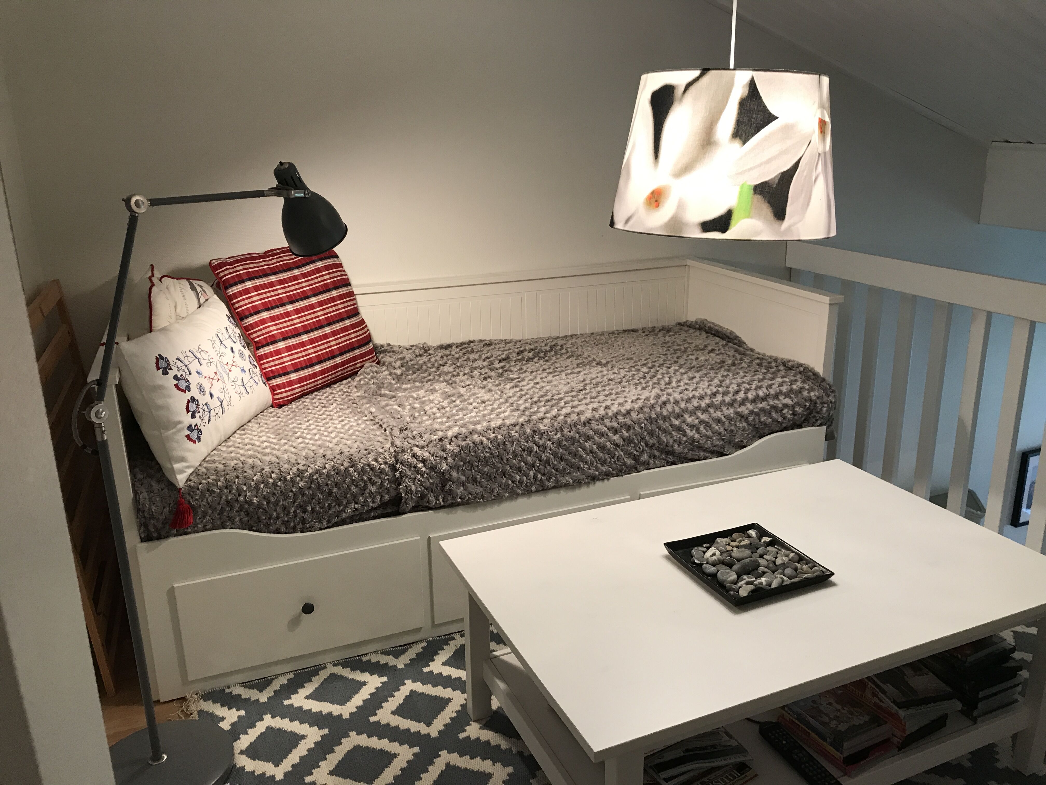 Sypialnia Zakwaterowanie obejmuje dwie sypialnie na parterze: jedną z podwójnym łóżkiem i jedną z pojedynczym łóżkiem. Schody na antresolę, gdzie znajdują się dwa pojedyncze łóżka oraz rozkładana sofa.