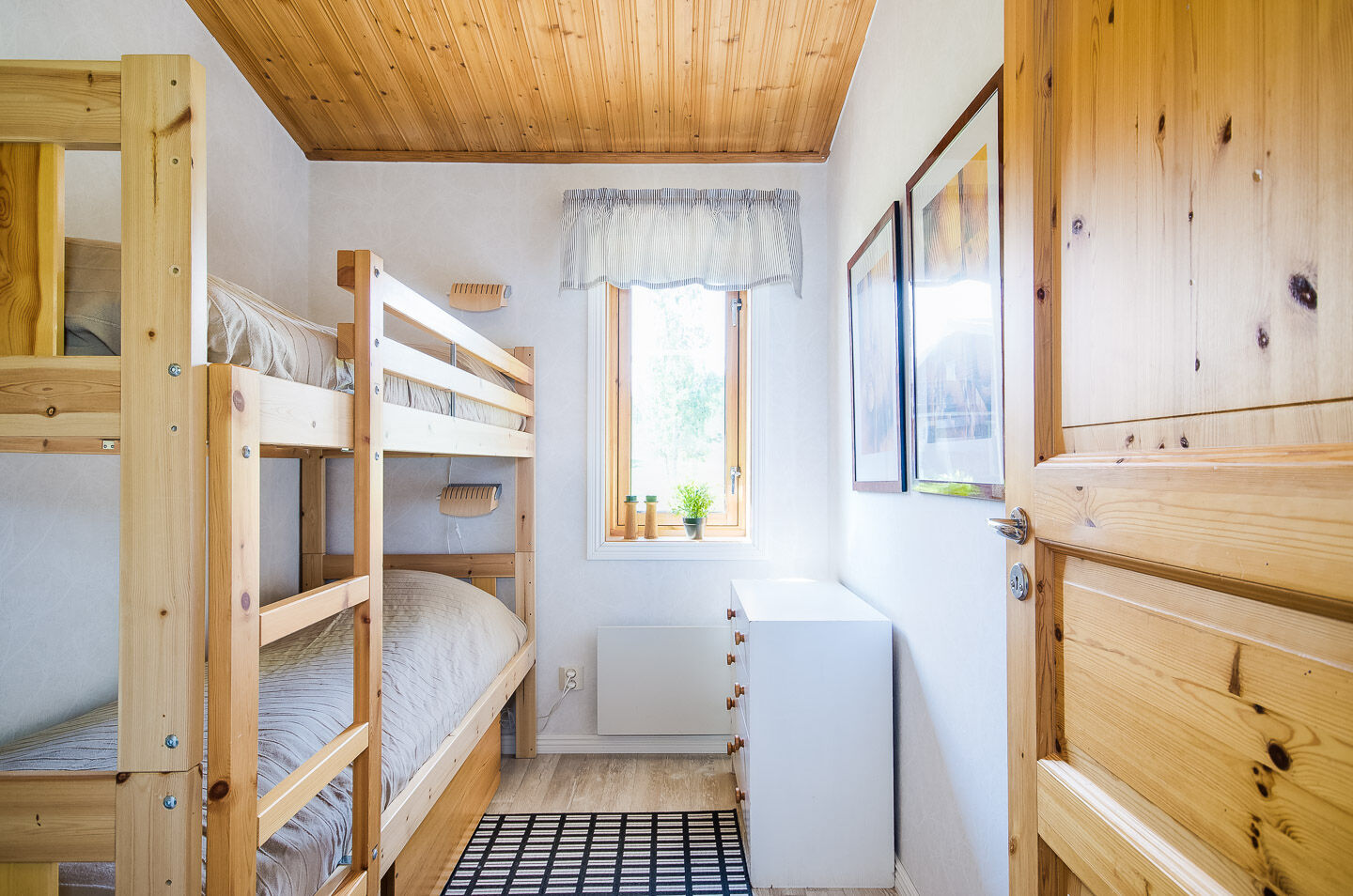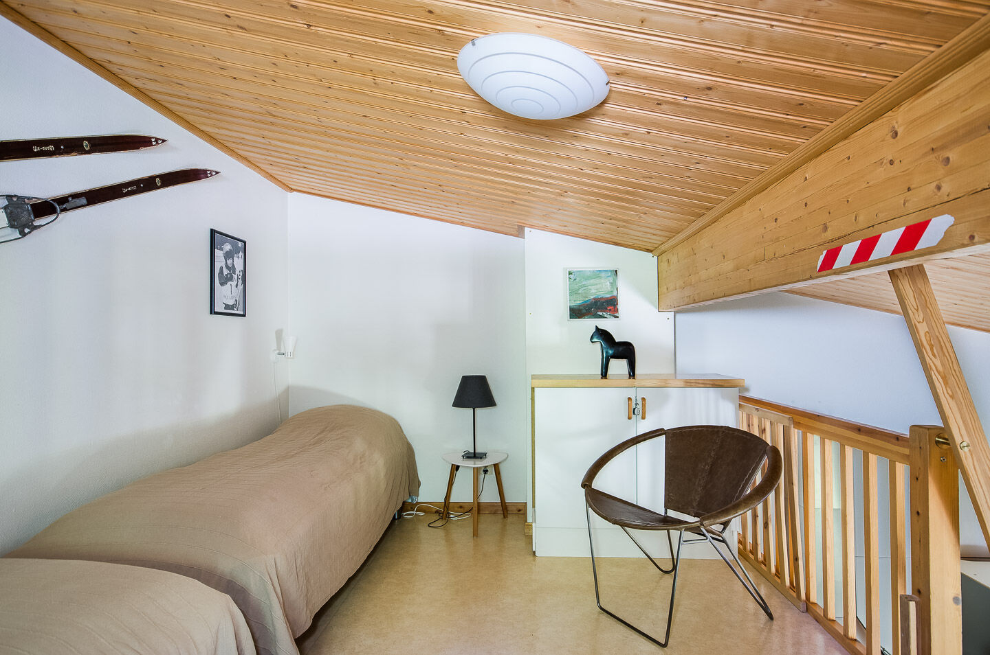 Sypialnie Zakwaterowanie posiada dwie sypialnie. Jedna z podwójnym łóżkiem (140 cm szerokości), a druga z łóżkiem piętrowym. Schody na antresolę, na której znajdują się dwa pojedyncze łóżka.