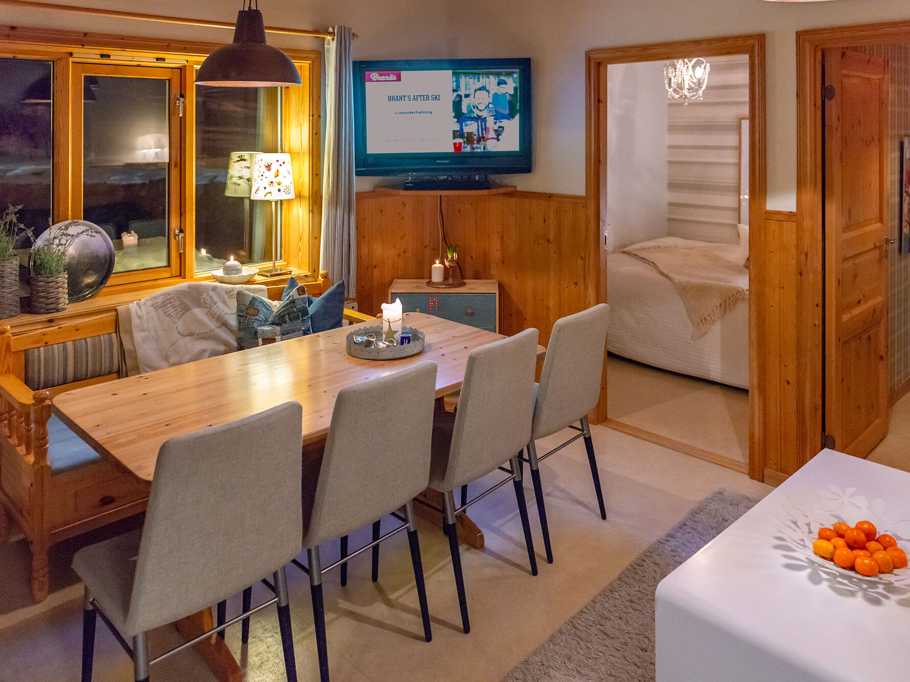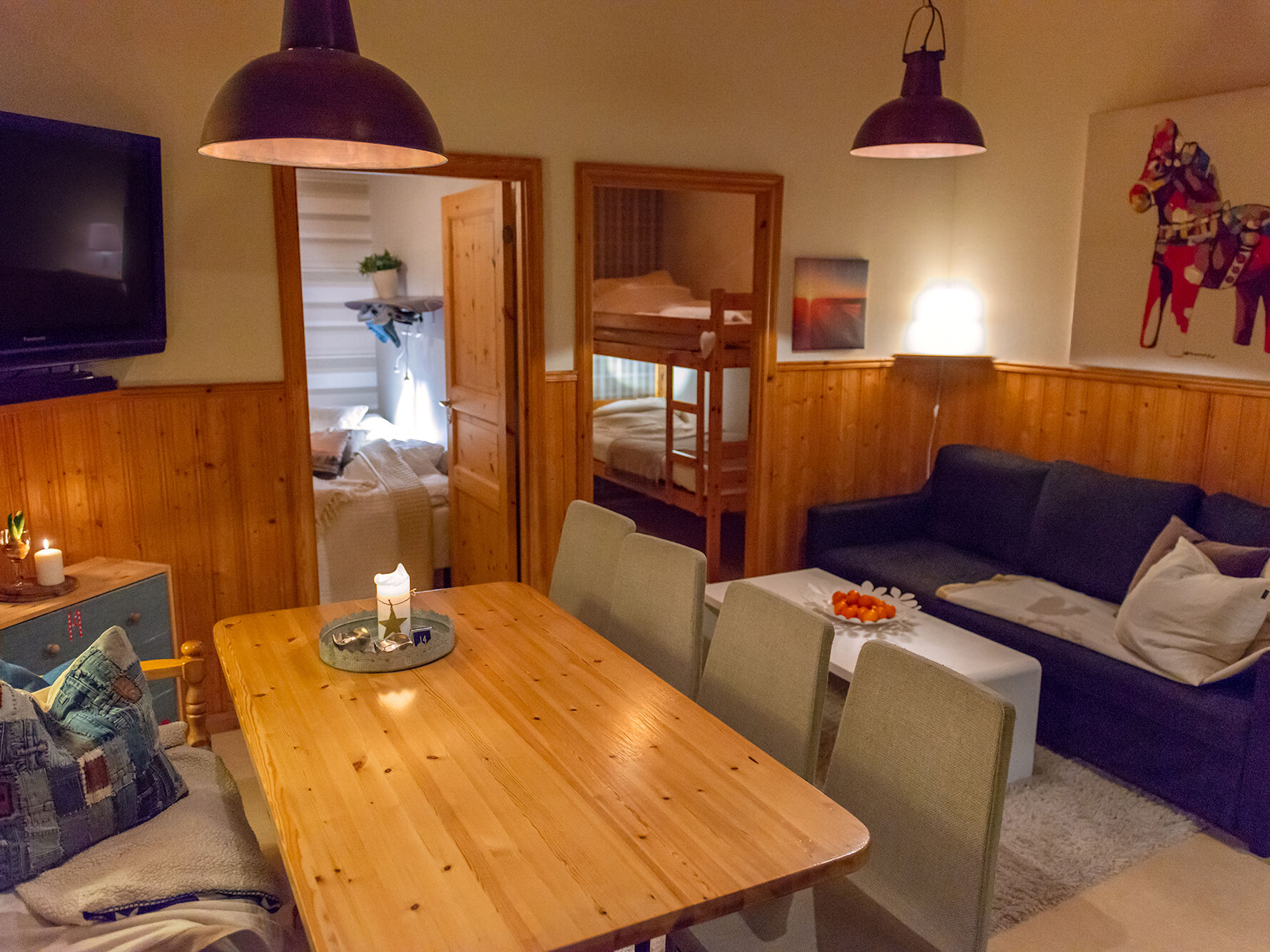 Allrum I allrummet finns en matgrupp och bäddsoffa. Alla våra boenden är kopplade till kabel-tv