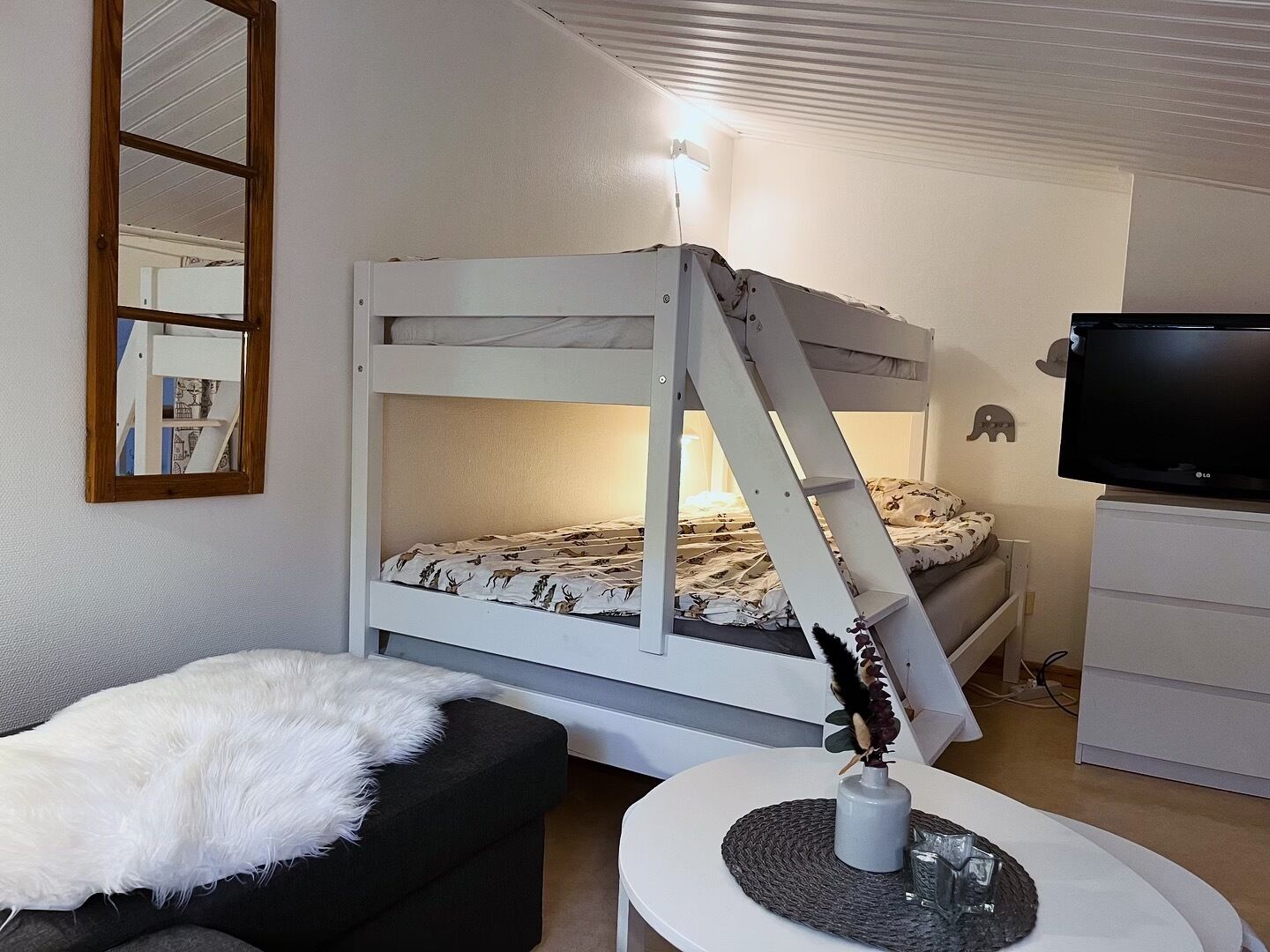 Sypialnie W apartamencie znajdują się dwie sypialnie. Sypialnia 1 ma łóżko piętrowe (90 cm) i łóżko podwójne (140 cm). Sypialnia 2 ma podwójne łóżko (160 cm). Na poddaszu znajduje się łóżko piętrowe i rozkładana kanapa (150 cm).