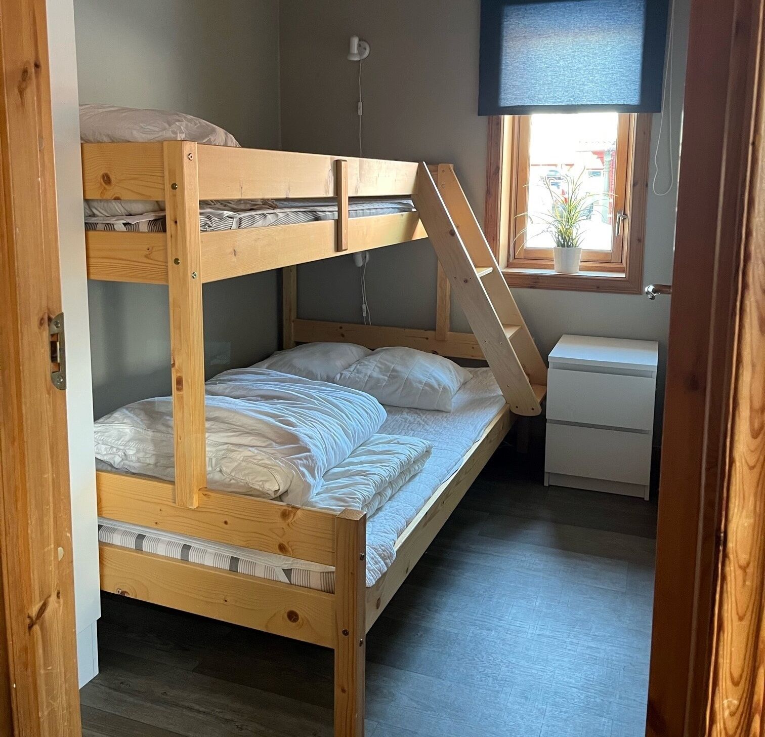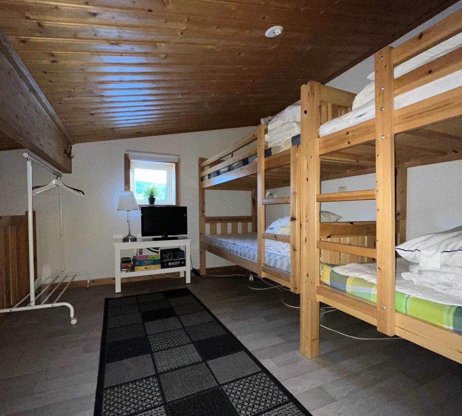 Zakwaterowanie posiada jedną sypialnię z łóżkiem piętrowym i jedną sypialnię z łóżkiem podwójnym. Schody prowadzą na antresolę, gdzie znajdują się dwa łóżka piętrowe i składane łóżko.