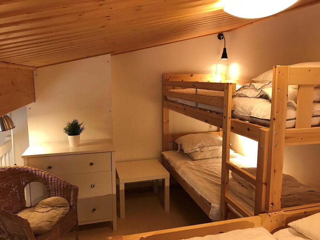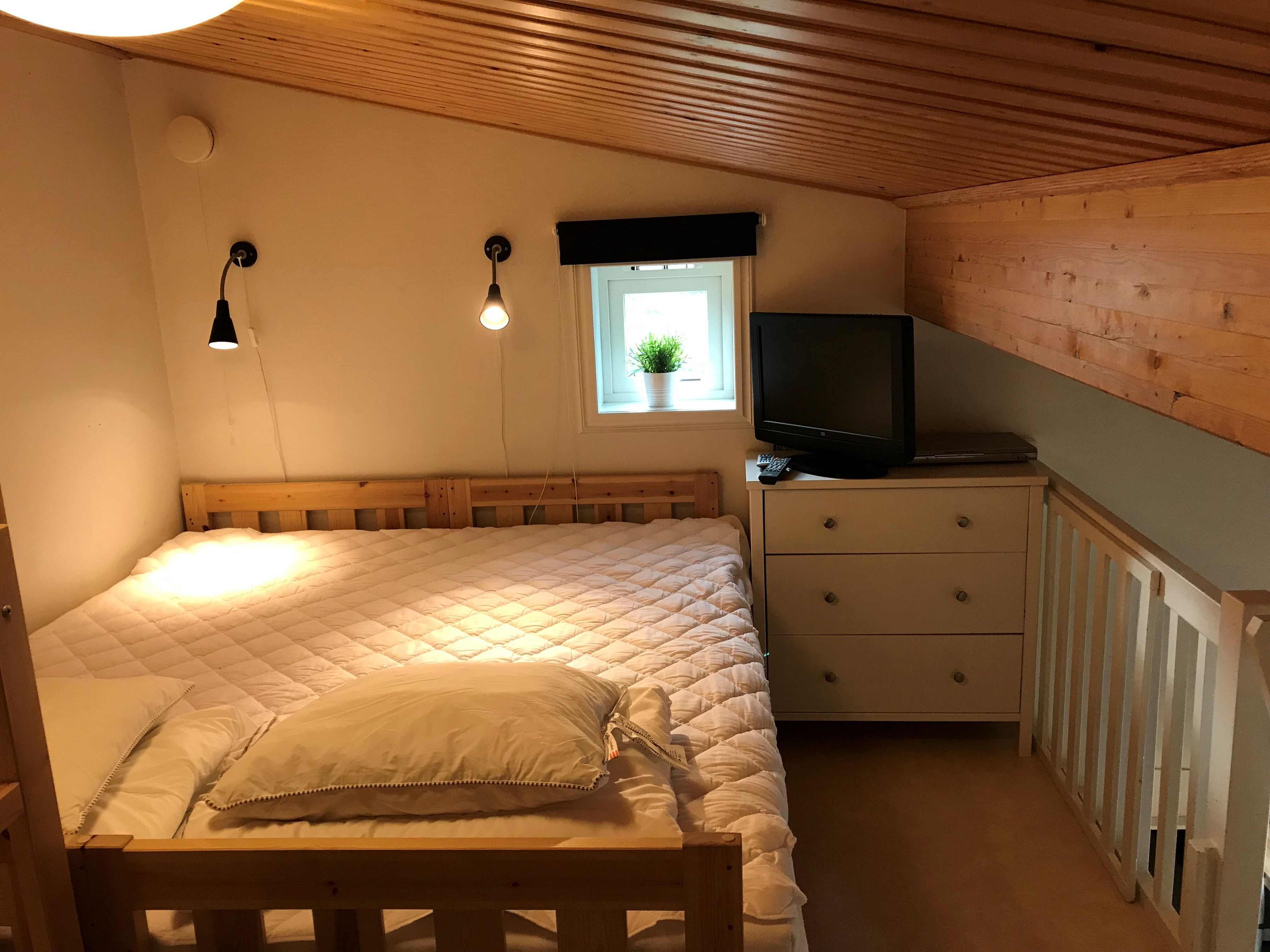 Sypialnia Domek posiada dwie sypialnie z łóżkami małżeńskimi 160 cm. Na poddasze prowadzą schody, gdzie znajduje się łóżko piętrowe i łóżko podwójne oraz telewizor. Zainstalowano także okno.