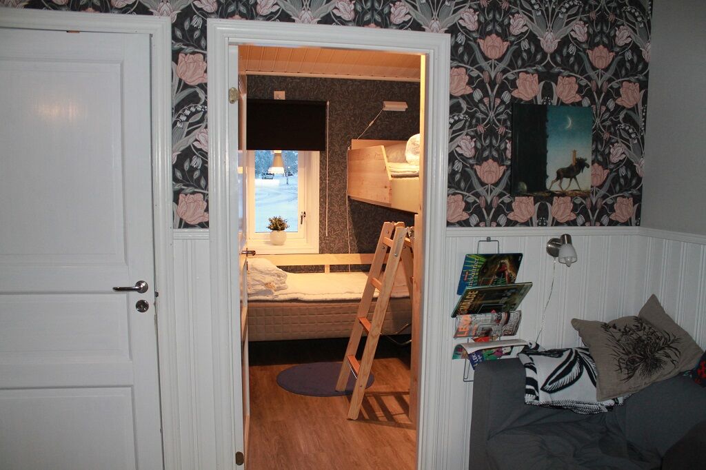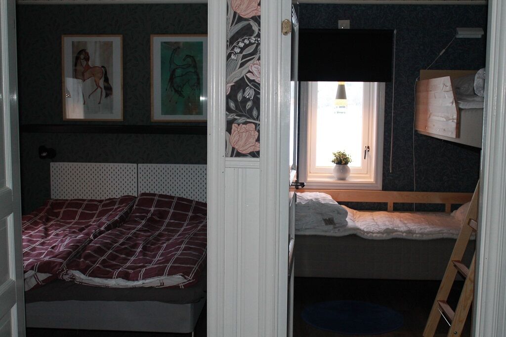 Sovrum I boendet finns två sovrum, ett med våningssäng och ett med dubbelsäng. Lofttrappa till loftet där det finns en våningssäng samt TV.