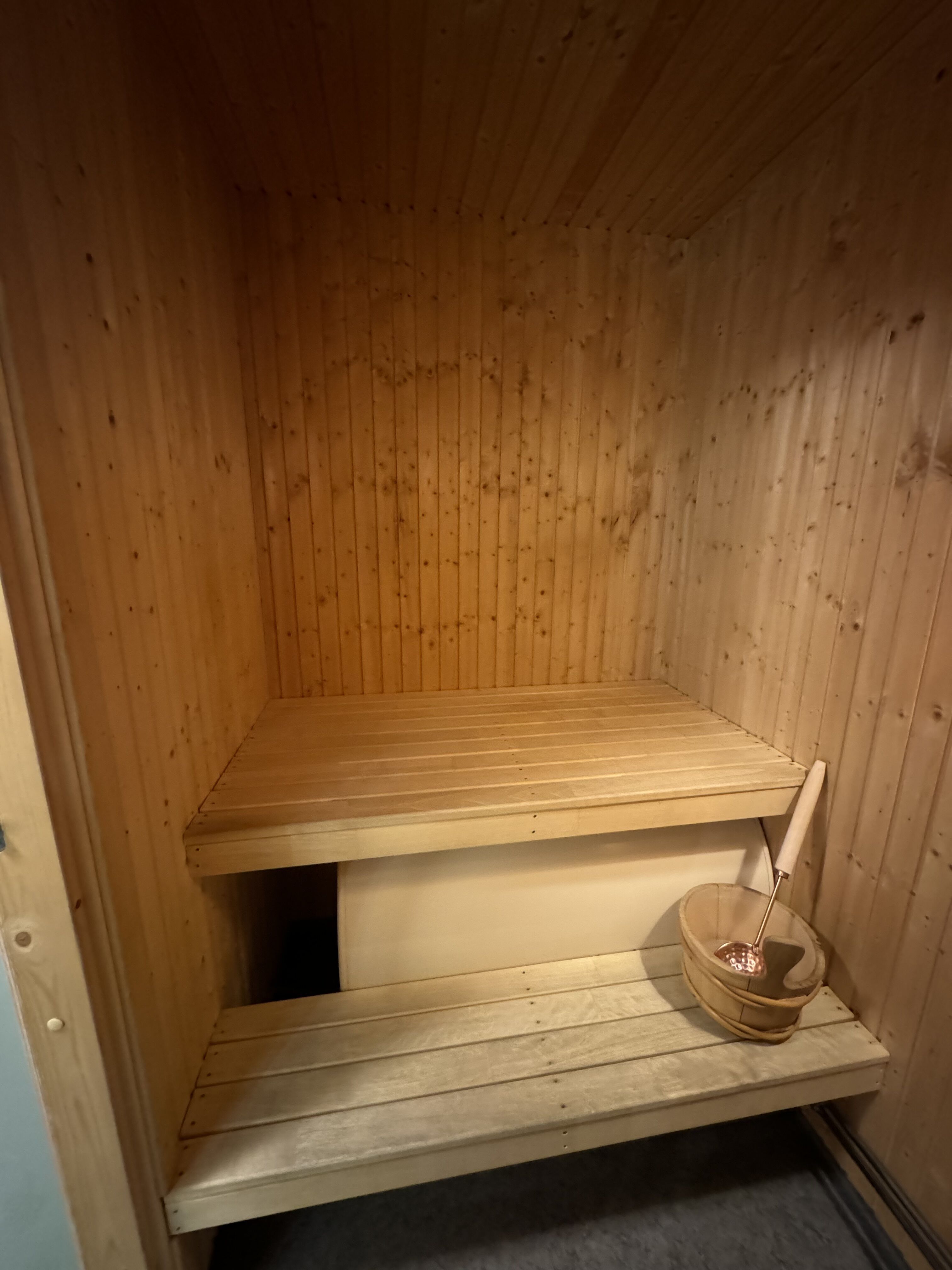 Łazienka Łazienka wyposażona w WC, prysznic i saunę.