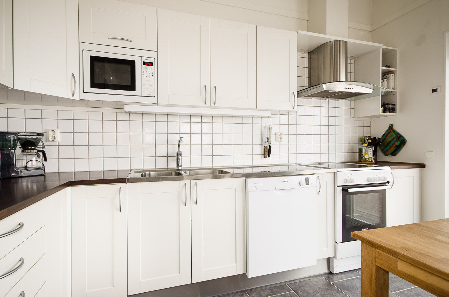 Kök Det välutrustade köket har bl.a. kyl och frys, spis med ugn, mikrovågsugn, kaffebryggare och brödrost. Dishwasher is available in the accommodation.