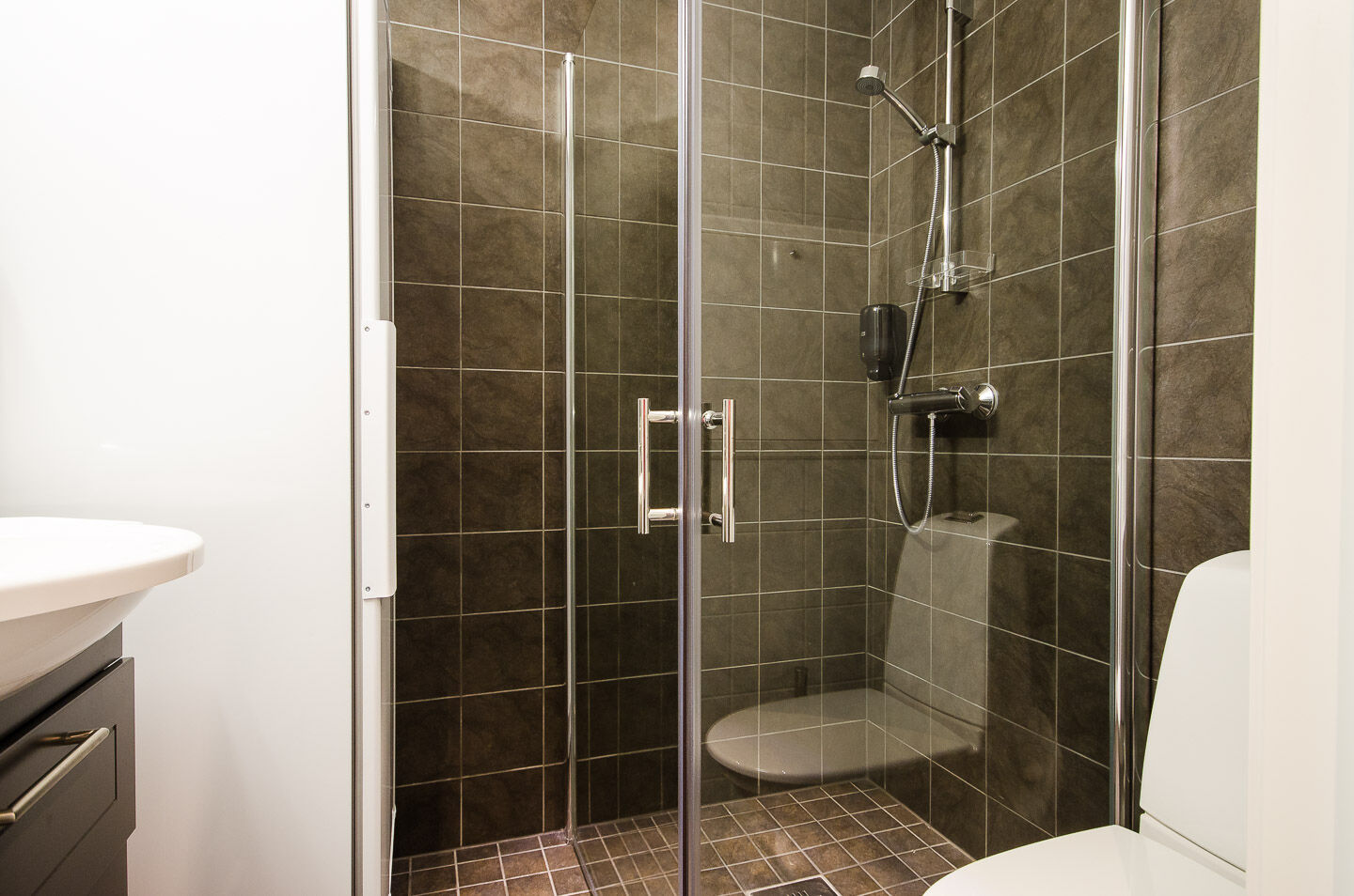 Łazienka Łazienka jest całkowicie wyłożona kafelkami, wyposażona w WC i prysznic. Zapewniamy papier toaletowy i suszarkę do włosów. Dostępne są także mydło i szampon.