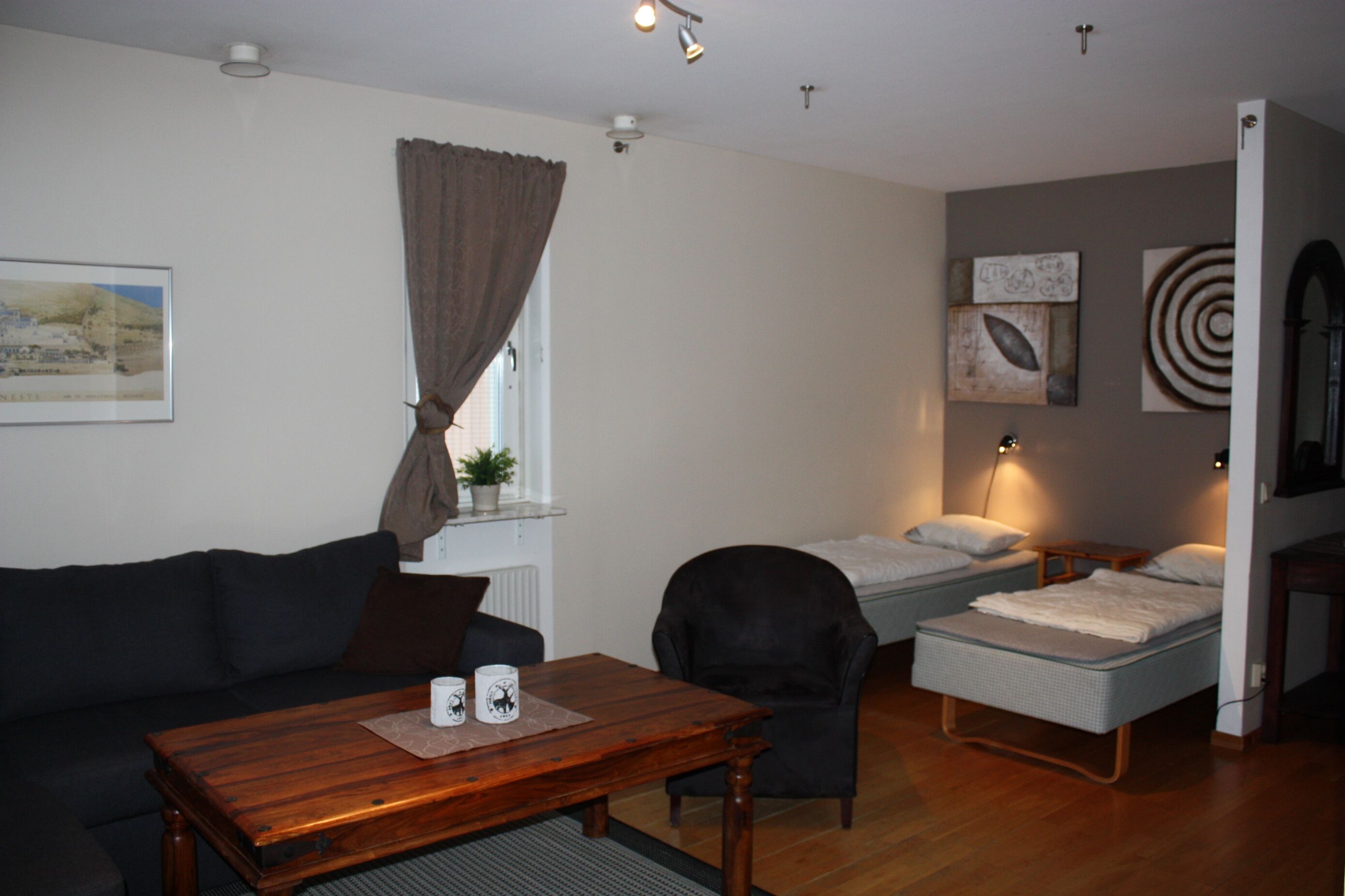 Allrum Allrummet har en bäddsoffa och ett soffbord. TV via Fiber Telia Lagom + 3 norska kanaler.