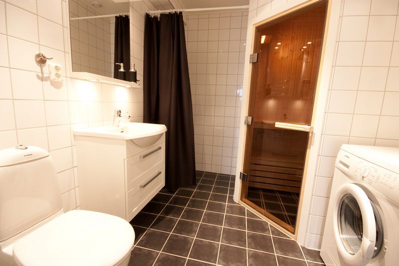 Łazienka Do dyspozycji gości są dwie toalety i dwa prysznice. W jednej z łazienek jest też sauna. Pralka jest dostępna.