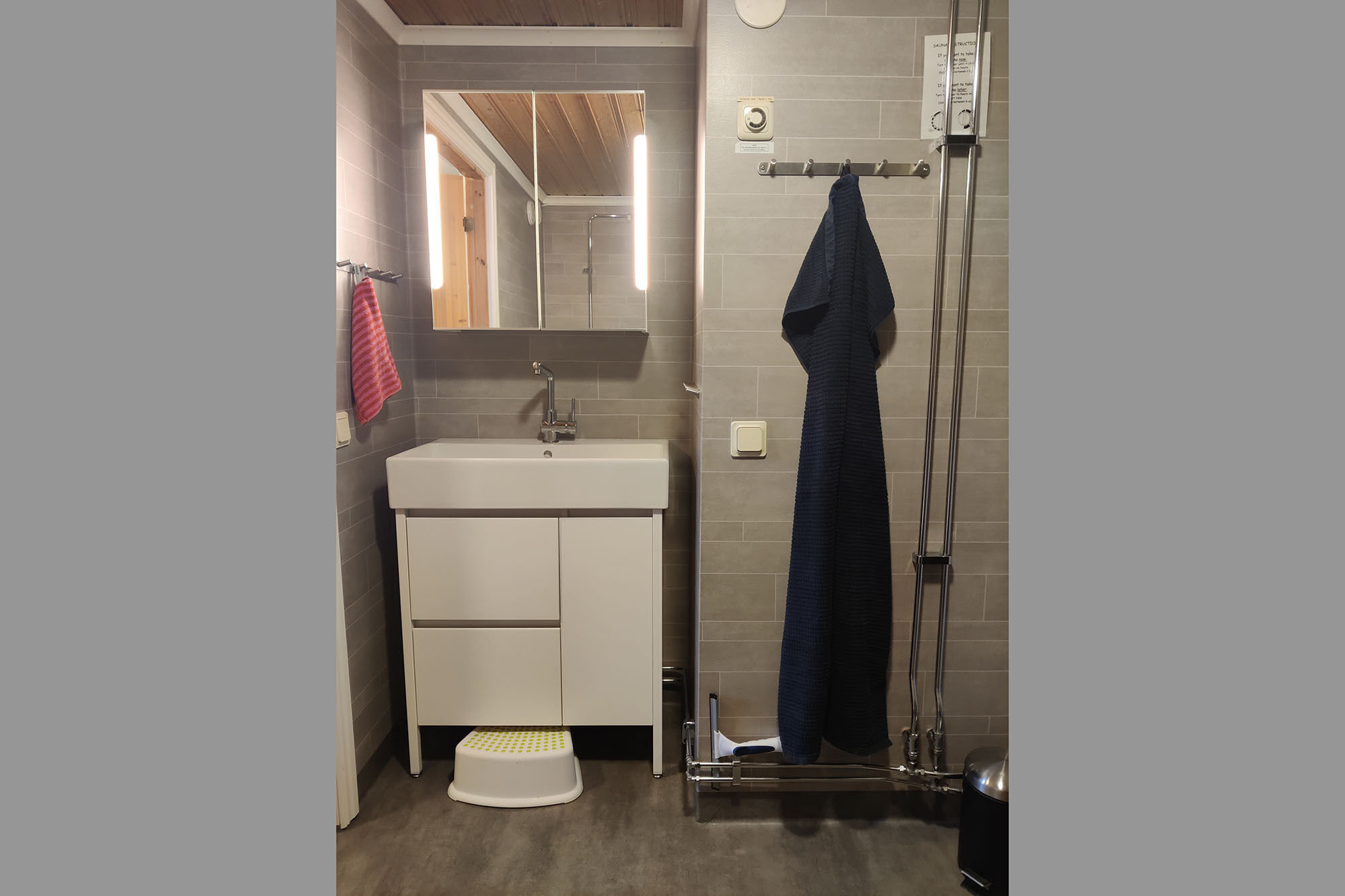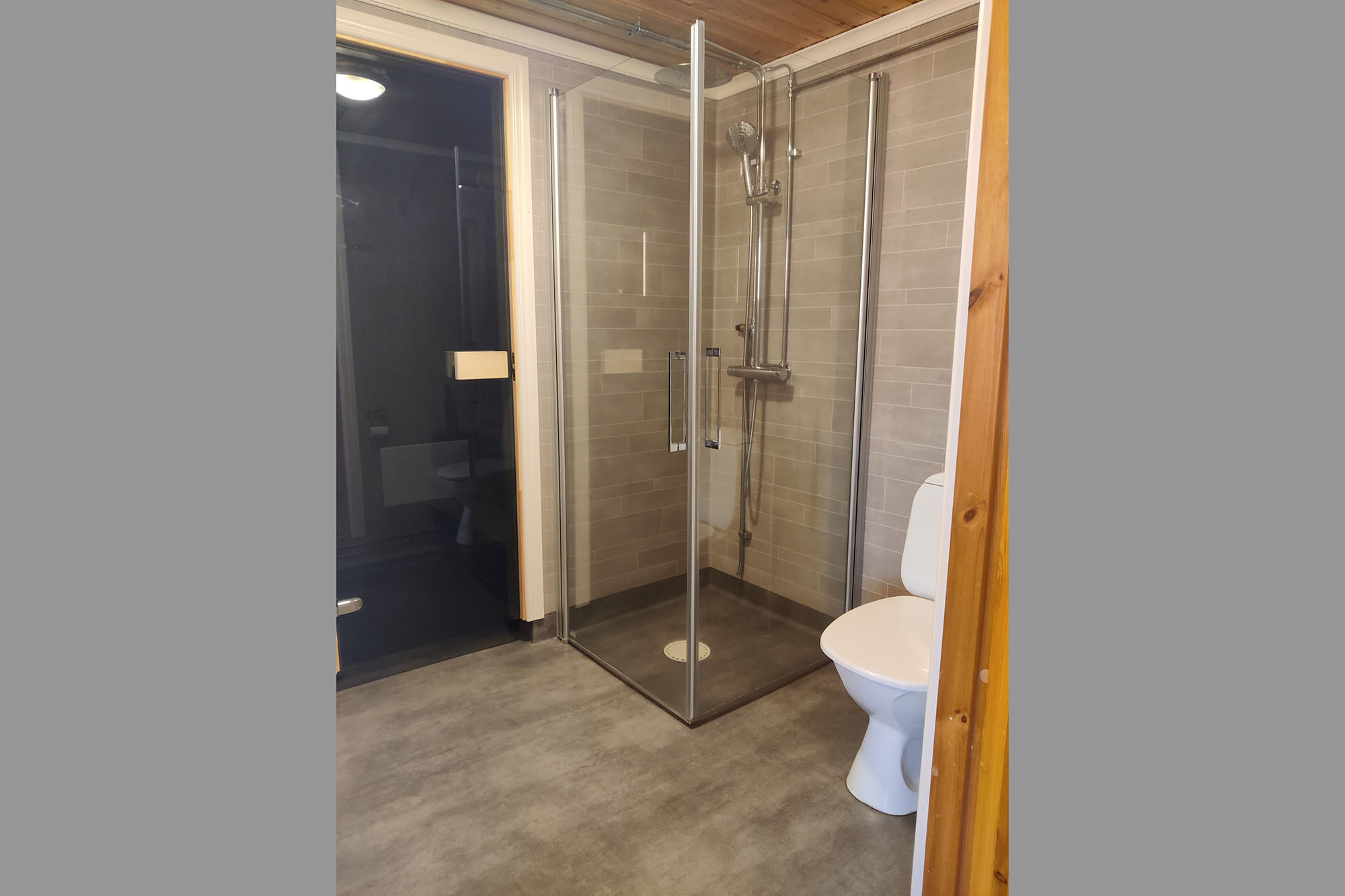 Badrum I badrummet finns WC, tvättkomod, dusch med glasväggar och bastu.