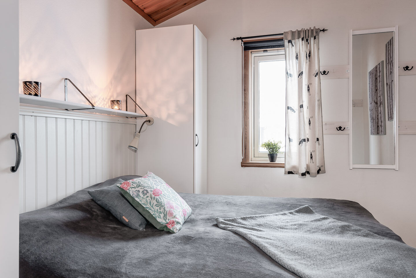 Sovrum I boendet finns två sovrum på nedre plan, ett med dubbelsäng och ett med våningssäng. Lofttrappa till sovloftet där det finns en dubbelsäng och två enkelsängar.