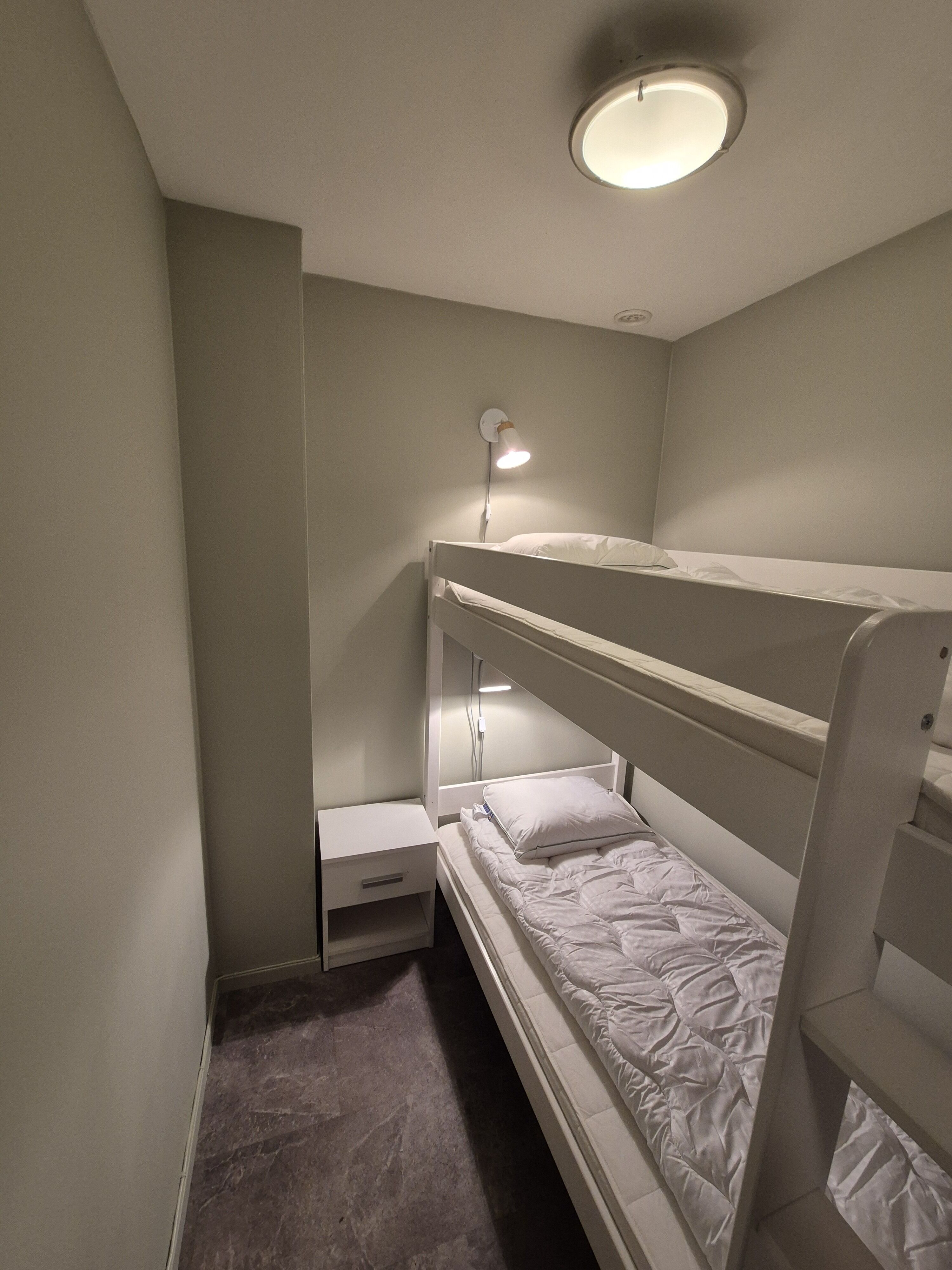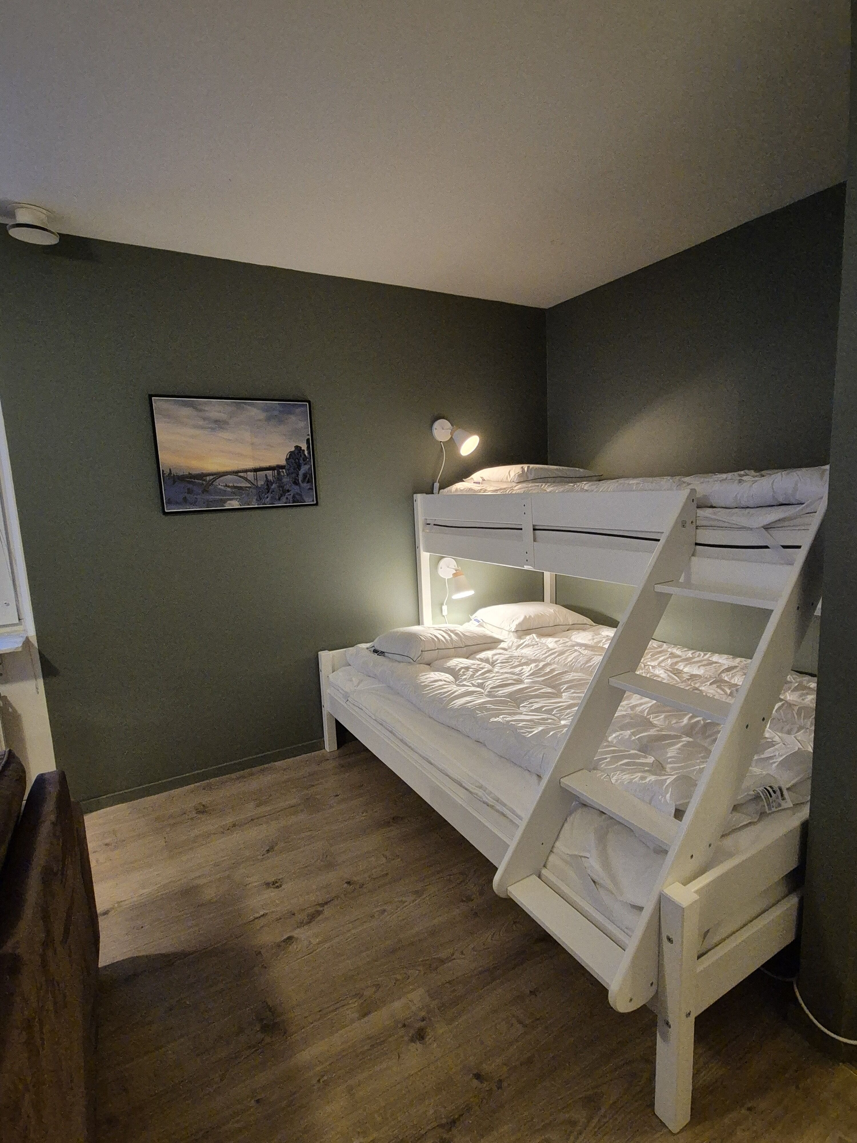 Sypialnia W sypialni (bez drzwi) znajduje się łóżko piętrowe, a w pokoju dziennym łóżko rodzinne o szerokości 150 cm na dole i 90 cm na górze. W mieszkaniu znajduje się dodatkowe łóżko.
