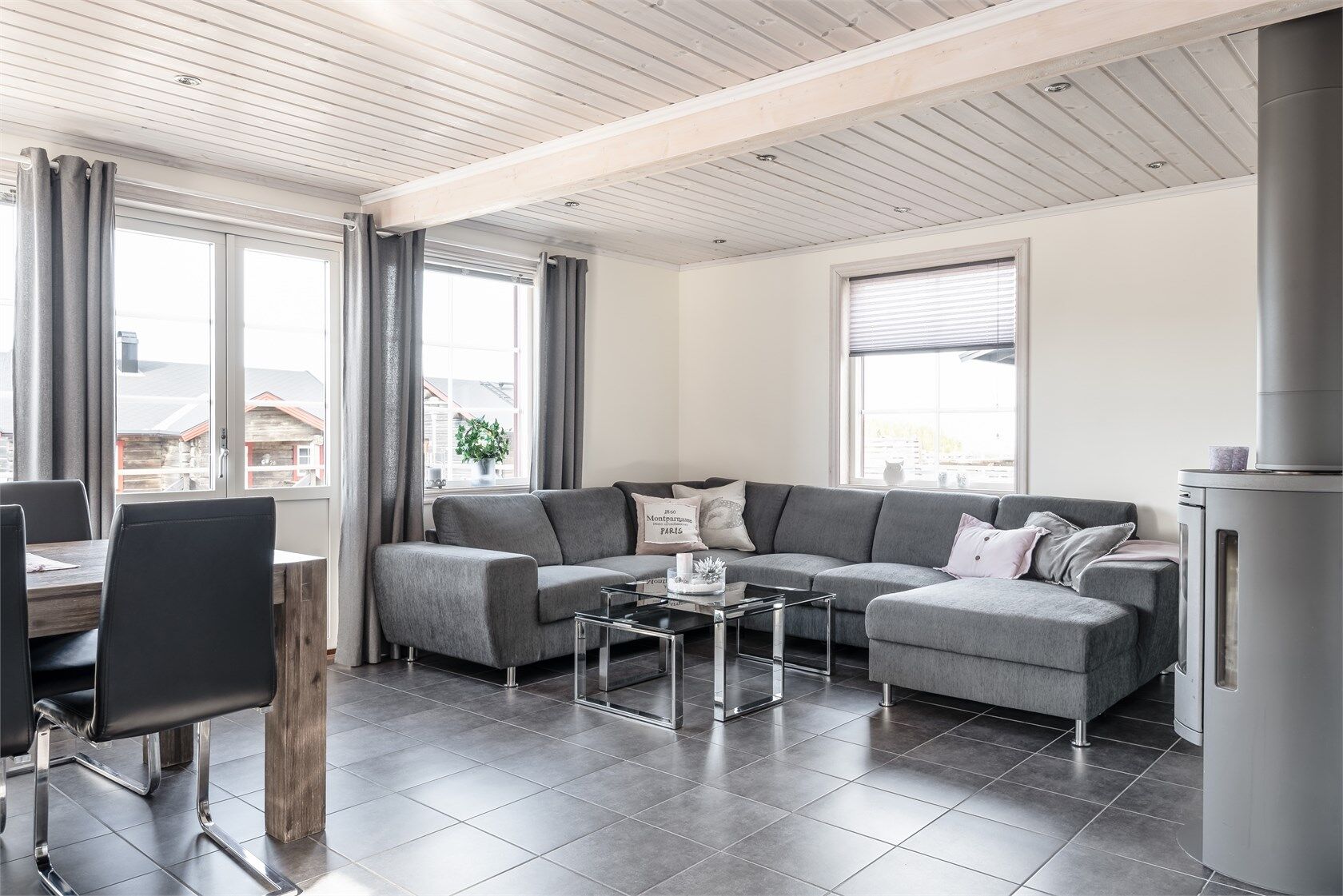 Allrum Det öppna allrummet på bottenplan har en braskamin, soffa och soffbord. Allrummet på loftet har rymlig soffa och ett soffbord. Alla våra boenden är kopplade till kabel-tv.