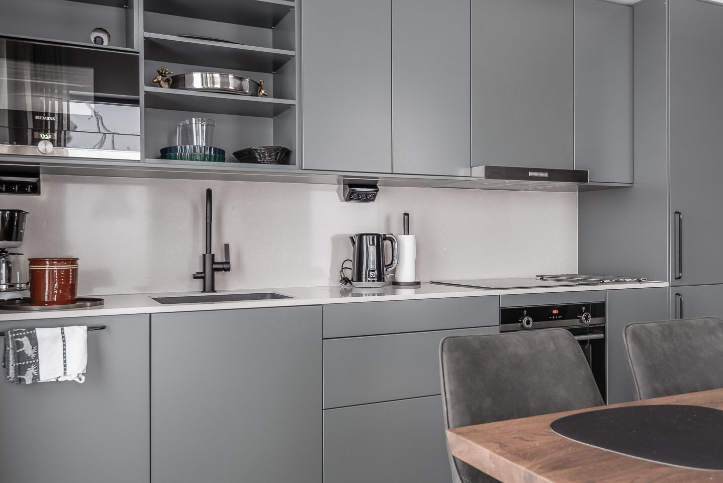 Kök Ett modernt kök, med bl.a. kyl och frys, spis med ugn, mikrovågsugn samt kaffebryggare.