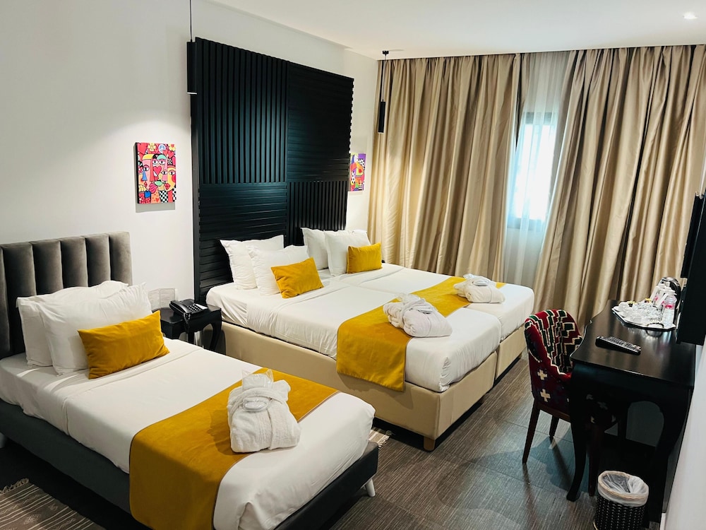 W czasie pobytu w obiekcie Hôtel Lac Léman, LES BERGES DU LAC w mieście Tunis (Les Berges du Lac) znajdziesz się 3 minut samochodem od atrakcji takiej jak Park rozrywki Tunisia Happy Land Park Dah Dah i 9 minut od miejsca takiego jak Ulica główna Habib Bourguiba. Hotel (spa) znajduje się 9,8 km od atrakcji takiej jak Tunezyjski Teatr Narodowy i 10,7 km od miejsca takiego jak Plaża La Goulette. Poczuj się jak w domu w 108 pokojach, których wyposażenie to minibar i telewizor plazmowy. Bezpłatny bezprzewodowy dostęp do internetu zapewni łączność ze światem, a telewizja satelitarna — rozrywkę. Prywatna łazienka — wyposażenie: wanny lub prysznice, bezpłatne przybory toaletowe i suszarki do włosów. Udogodnienia obejmują sejfy i czajnik elektryczny oraz sprzątanie codziennie. Udogodnienia biznesowe to centrum biznesowe, ekspresowe zameldowanie oraz ekspresowe wymeldowanie. Ten obiekt typu hotel oferuje następującą liczbę sal konferencyjnych: 9. Płatne udogodnienia to transport z i na lotnisko (całą dobę). Dostępna jest także taka usługa jak bezpłatne parkowanie przez obsługę. Zrelaksuj się w spa, które oferuje masaż, zabiegi na ciało i zabiegi na twarz. Ten hotel oferuje również udogodnienia takie jak bezpłatny bezprzewodowy dostęp do internetu, obsługa portierska i salon fryzjerski. Hotel: znajduje się tutaj restauracja, gdzie serwowane są obiad i kolacja. Możesz zostać w pokoju i skorzystać z obsługi pokojowej. Zrelaksuj się po całym dniu w barze/salonie klubowym. Śniadanie w formie bufetu jest podawane codziennie od 6 do 10 za opłatą.