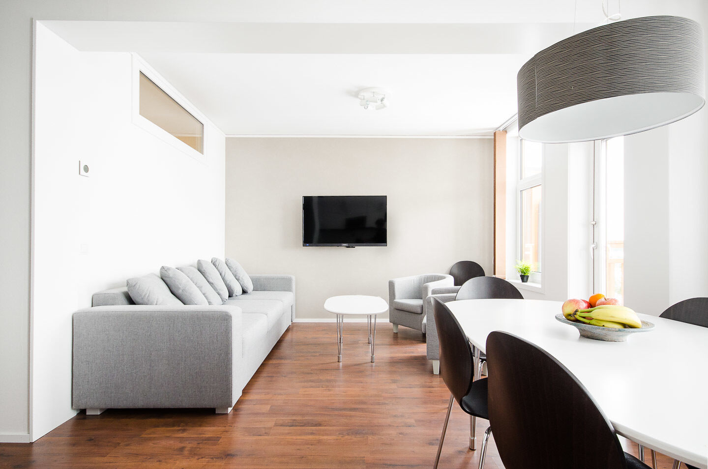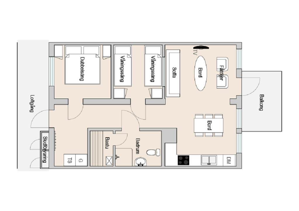 Allrum I det öppna allrummet finns en bäddsoffa med två bäddar, soffbord och TV. Alla våra boenden är kopplade till kabel-tv.