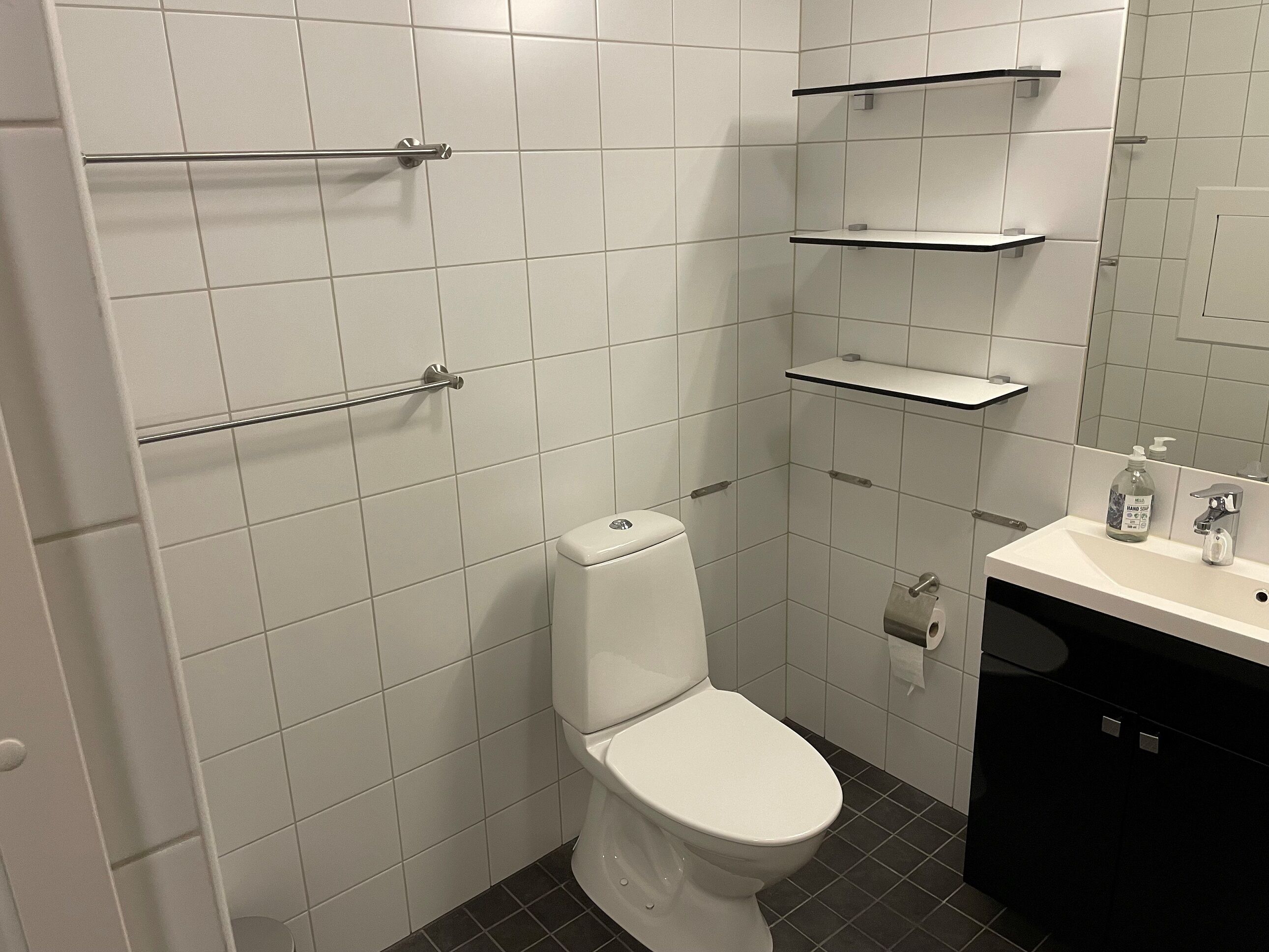 Łazienka W apartamencie znajduje się łazienka z WC, prysznicem i sauną. Łazienka posiada ogrzewanie podłogowe.