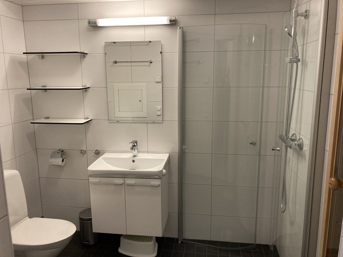 Łazienka W mieszkaniu znajduje się łazienka z WC, prysznicem i sauną oraz pralką. Łazienka ma ogrzewanie podłogowe.