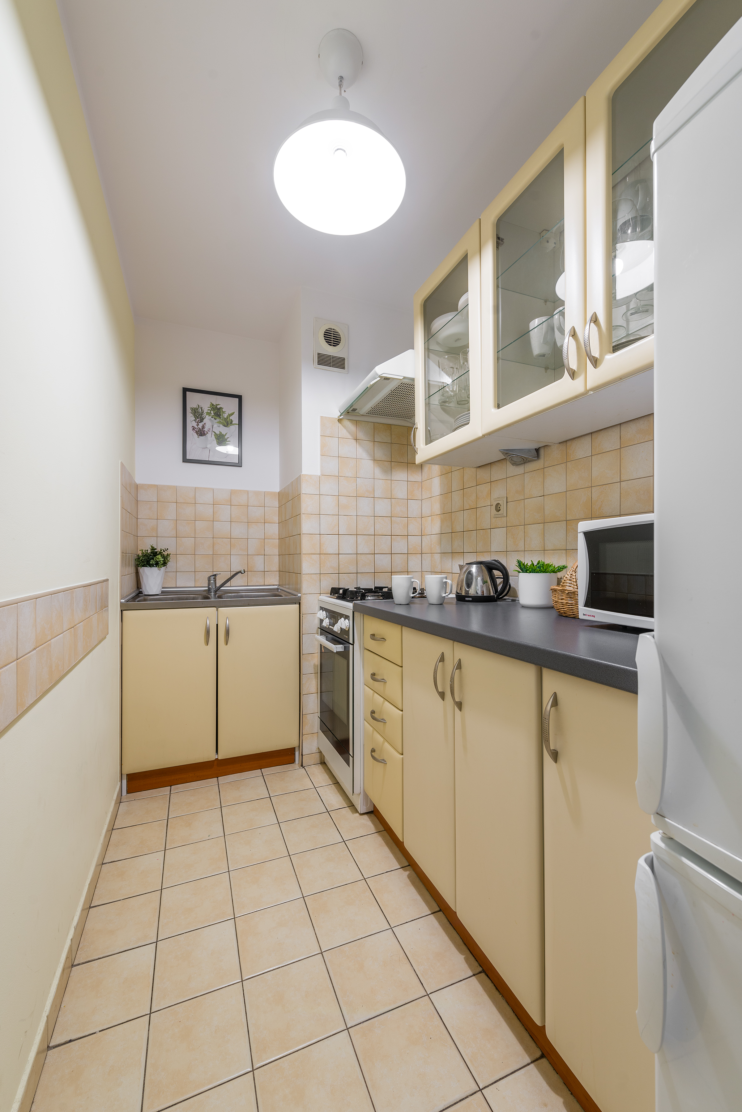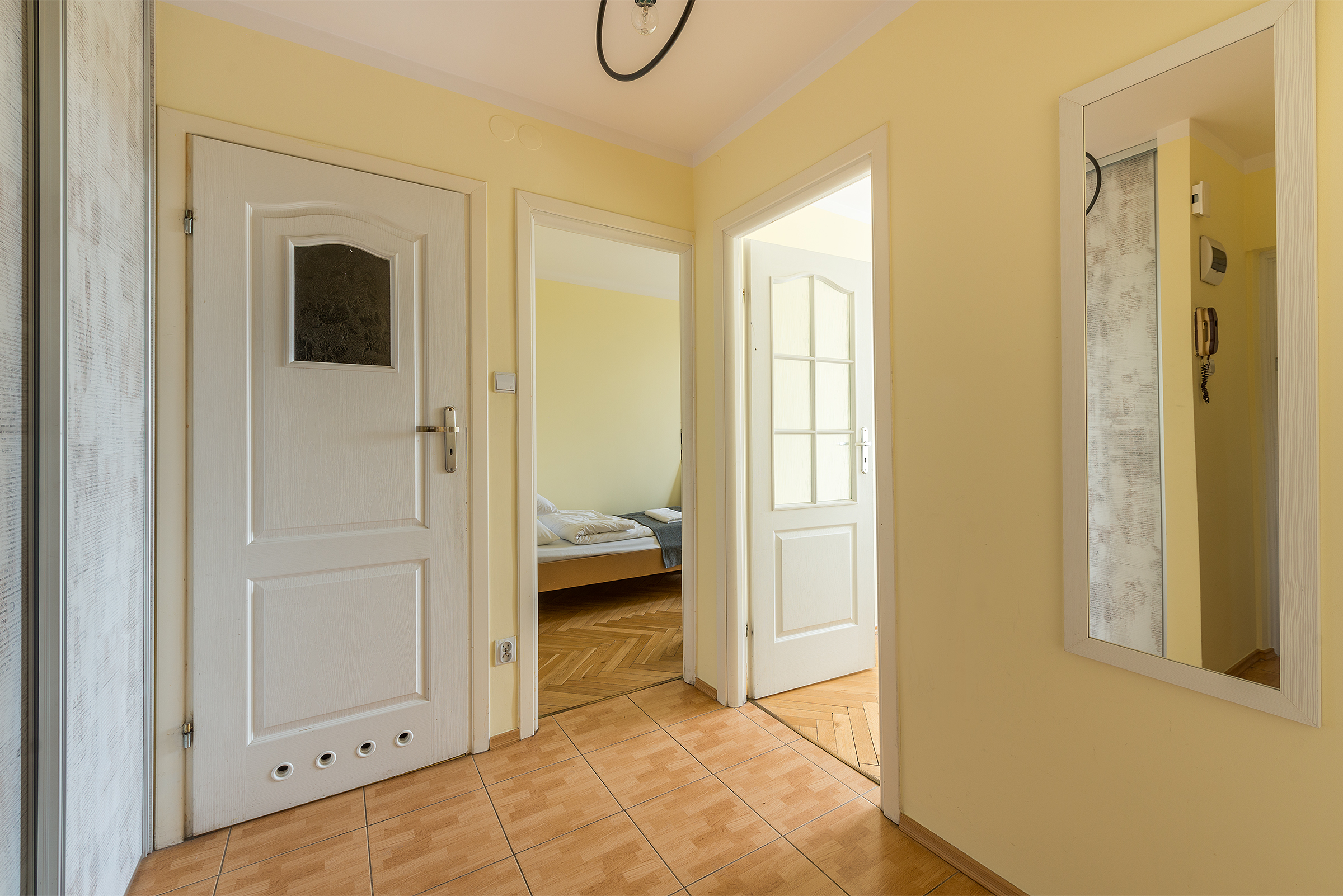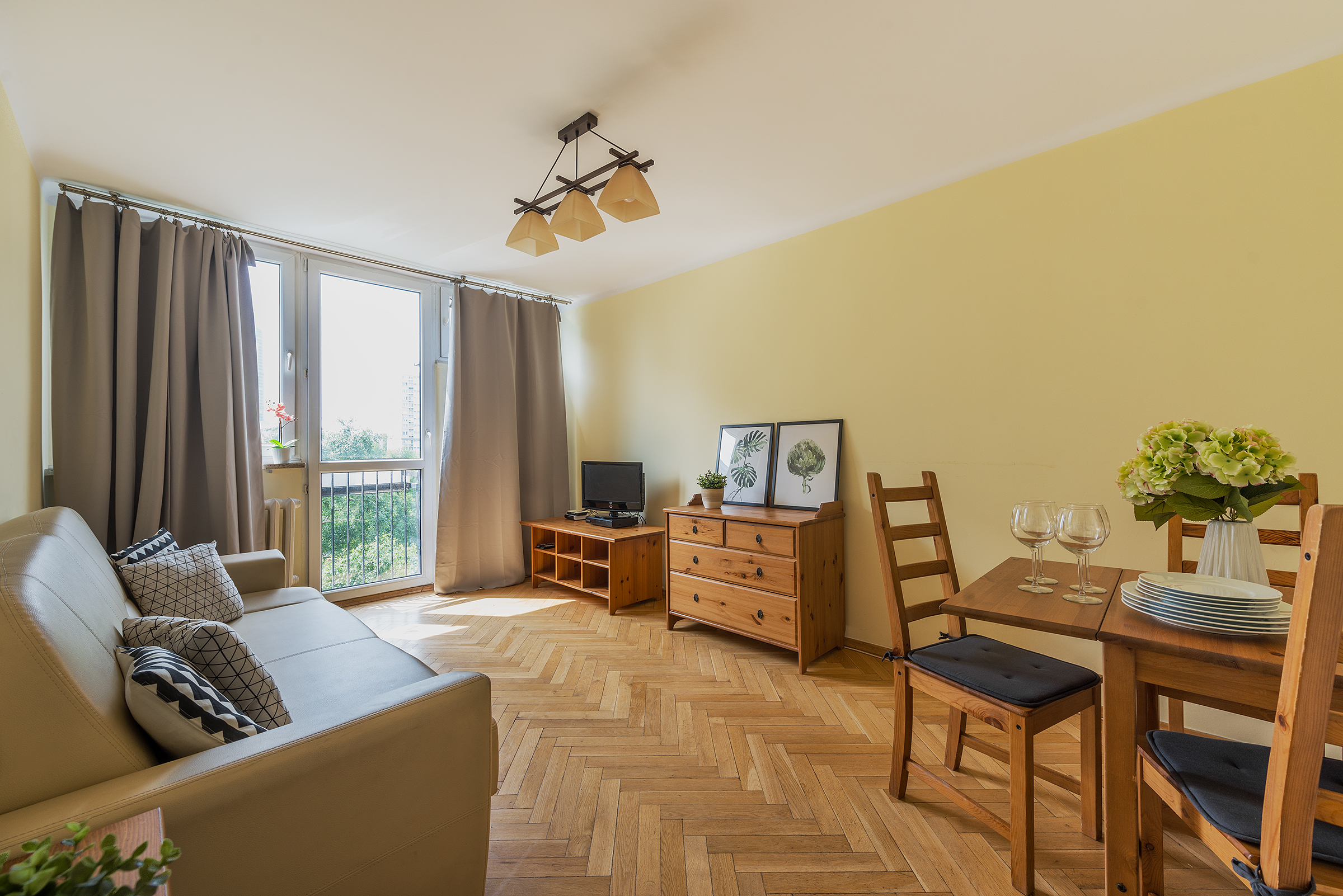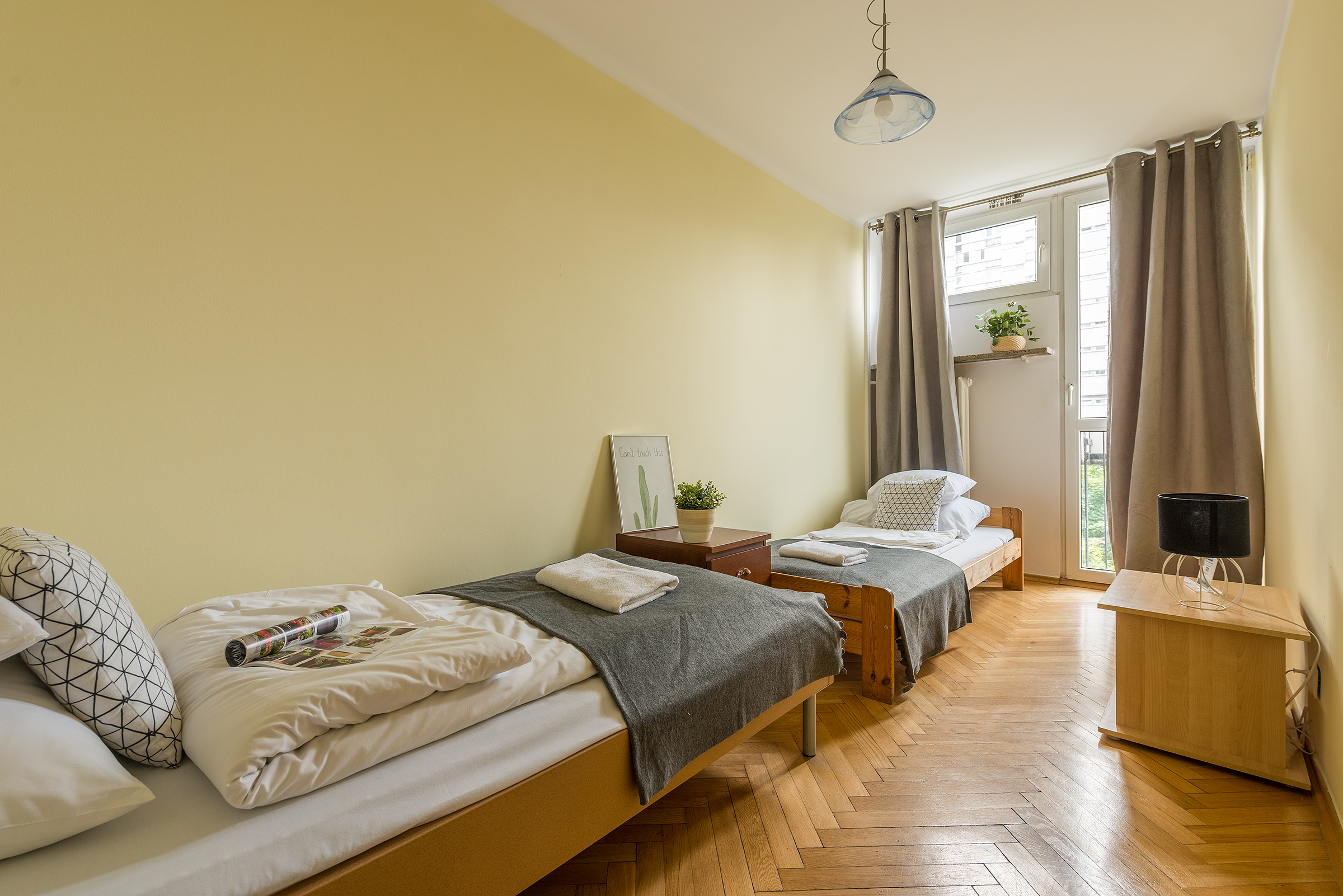 Ten trzypokojowy apartament w centrum Warszawy znajduje si na pitym pitrze bezpiecznego budynku przy ulicy Krochmalnej 3, wyposaonego w domofon i now wind. Do dyspozycji Goci internet i telewizja kablowa. W pobliu znajduje si doskonaa komunikacja miejska rondo ONZ jest oddalone o zaledwie 5 minut, a stacja metra witokrzyska o 10 minut. Apartament skada si z dwóch oddzielnych sypialni, salonu z rozkadan sof oraz w peni wyposaonej kuchni. W salonie znajduje si 22-calowy telewizor LCD i radio. Kuchnia wyposaona jest w lodówk, pralk, czajnik elektryczny oraz kuchenk gazowo-elektryczn. W pierwszej sypialni znajduj si dwa pojedyncze óka, a w drugiej óko podwójne, biurko, rozkadany stó z krzesami, telewizja kablowa i internet. Na parterze budynku znajduje si may kiosk spoywczy.