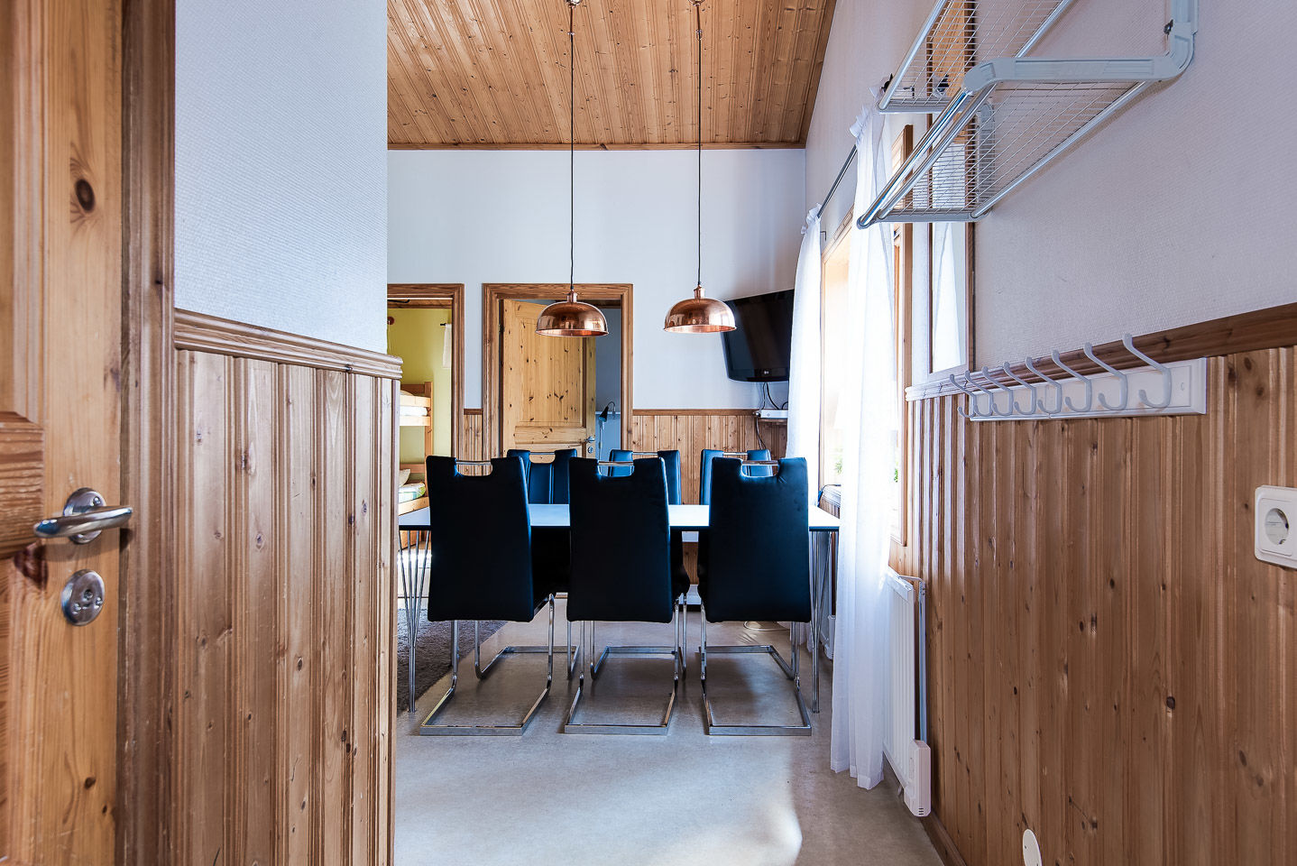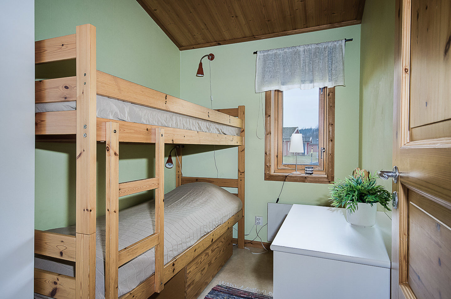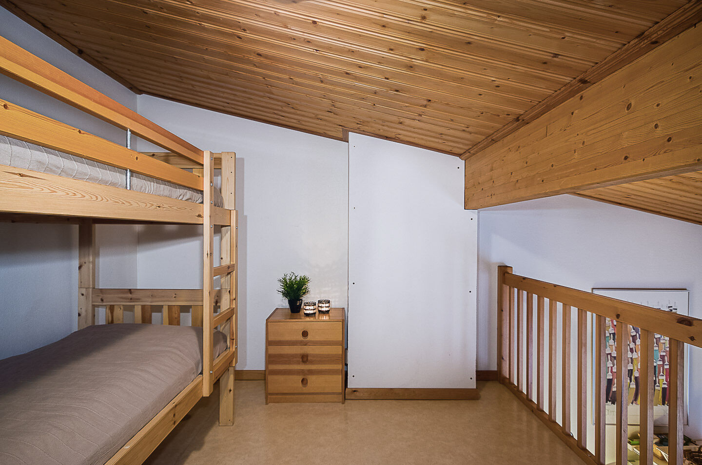 Sypialnie Zakwaterowanie zawiera dwa pokoje, jeden z łóżkiem piętrowym i jeden z dwoma pojedynczymi łóżkami. Schody na antresolę, gdzie znajdują się dwa łóżka piętrowe.