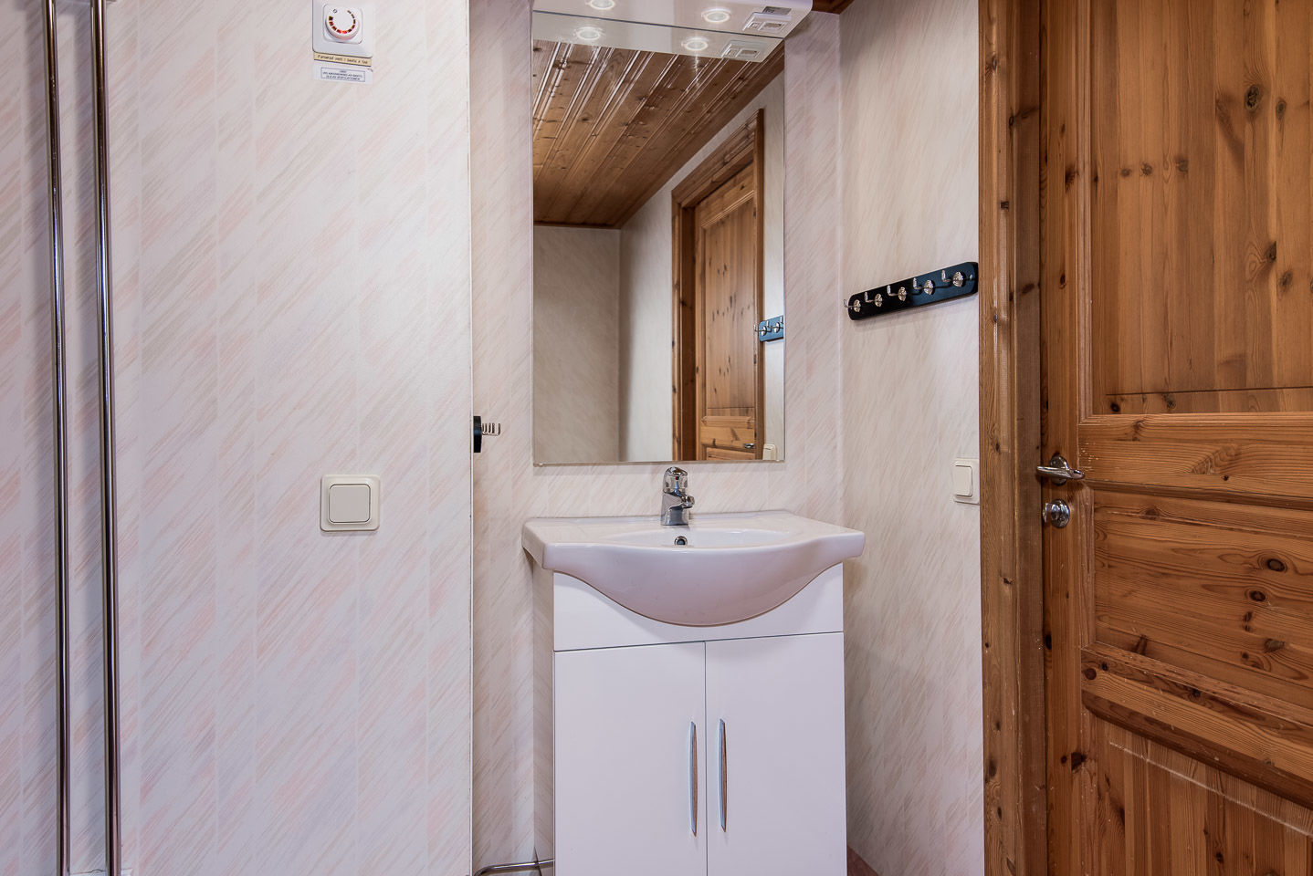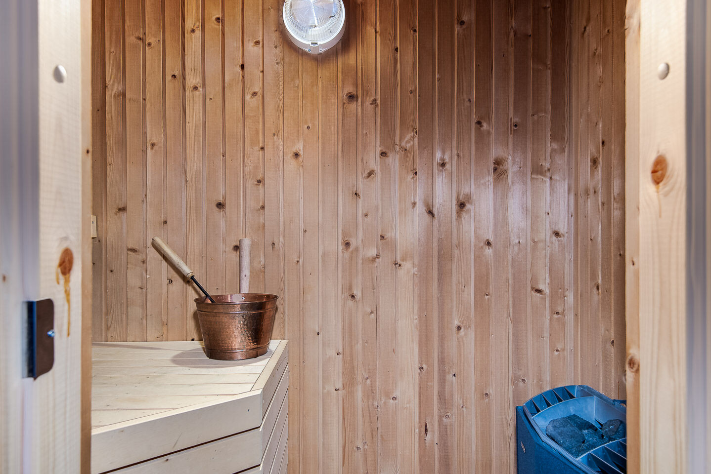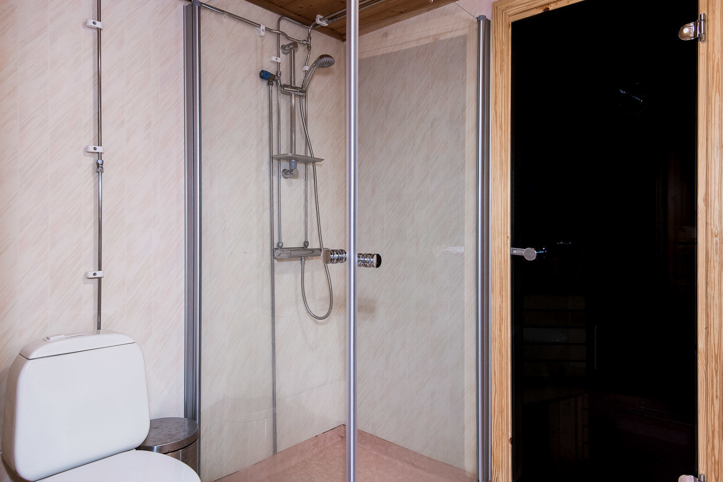 Łazienka Łazienka wyposażona jest w WC, prysznic oraz saunę.