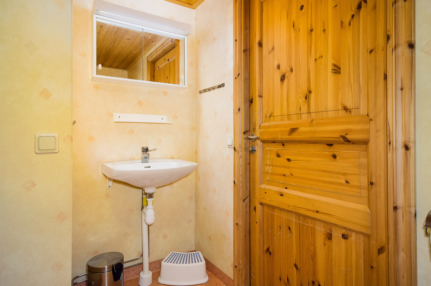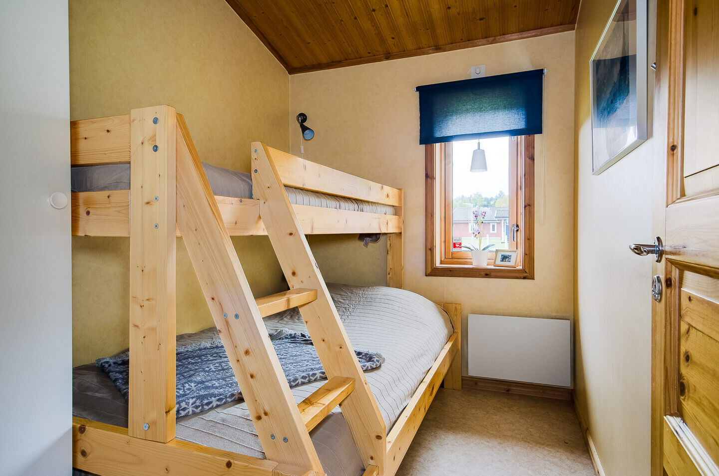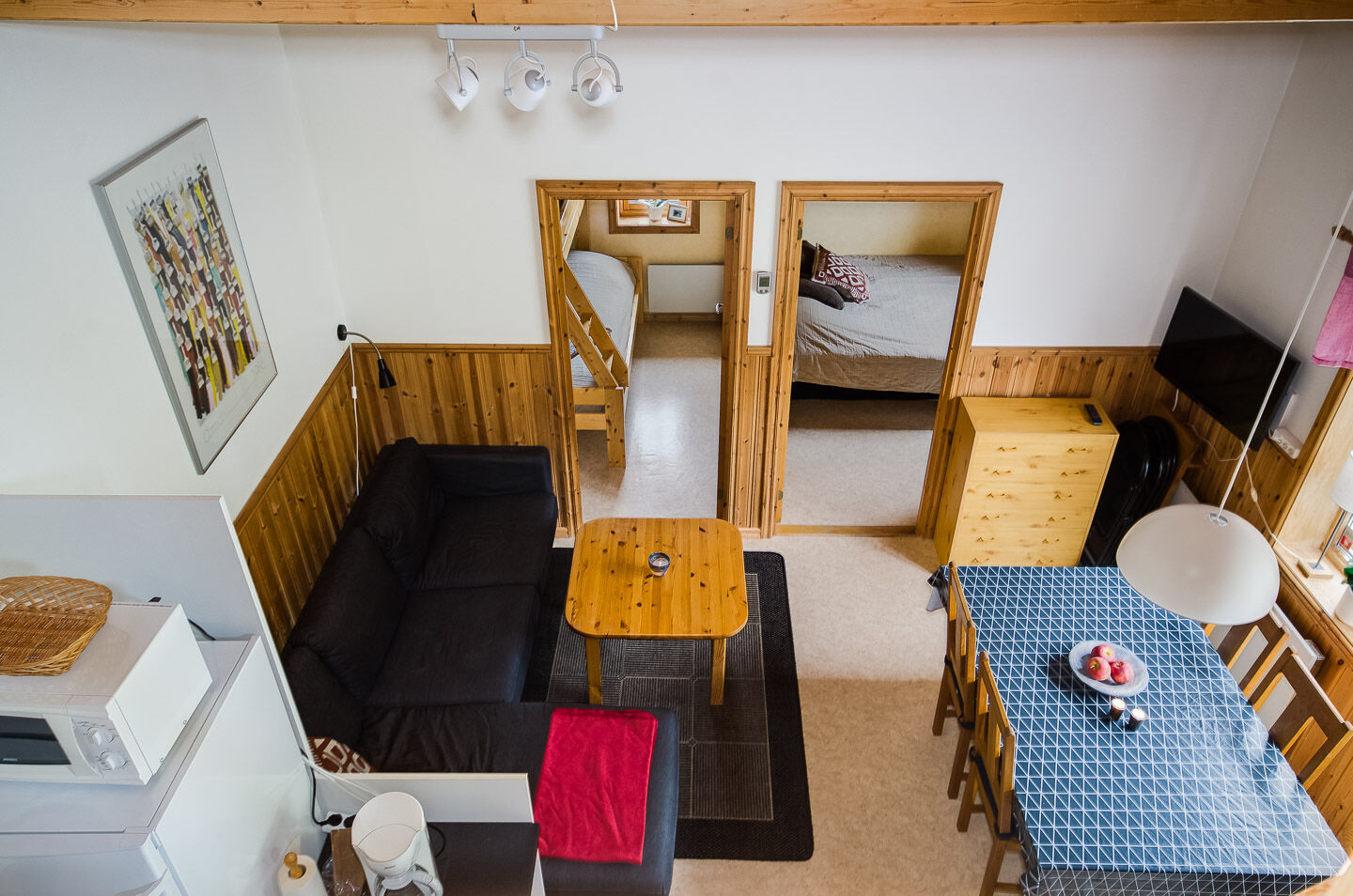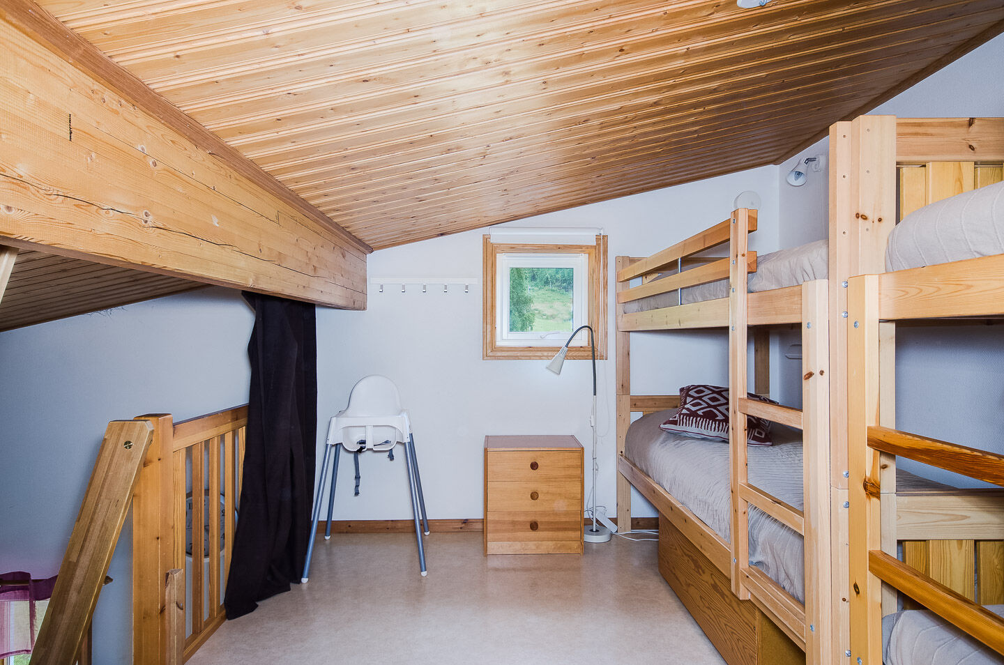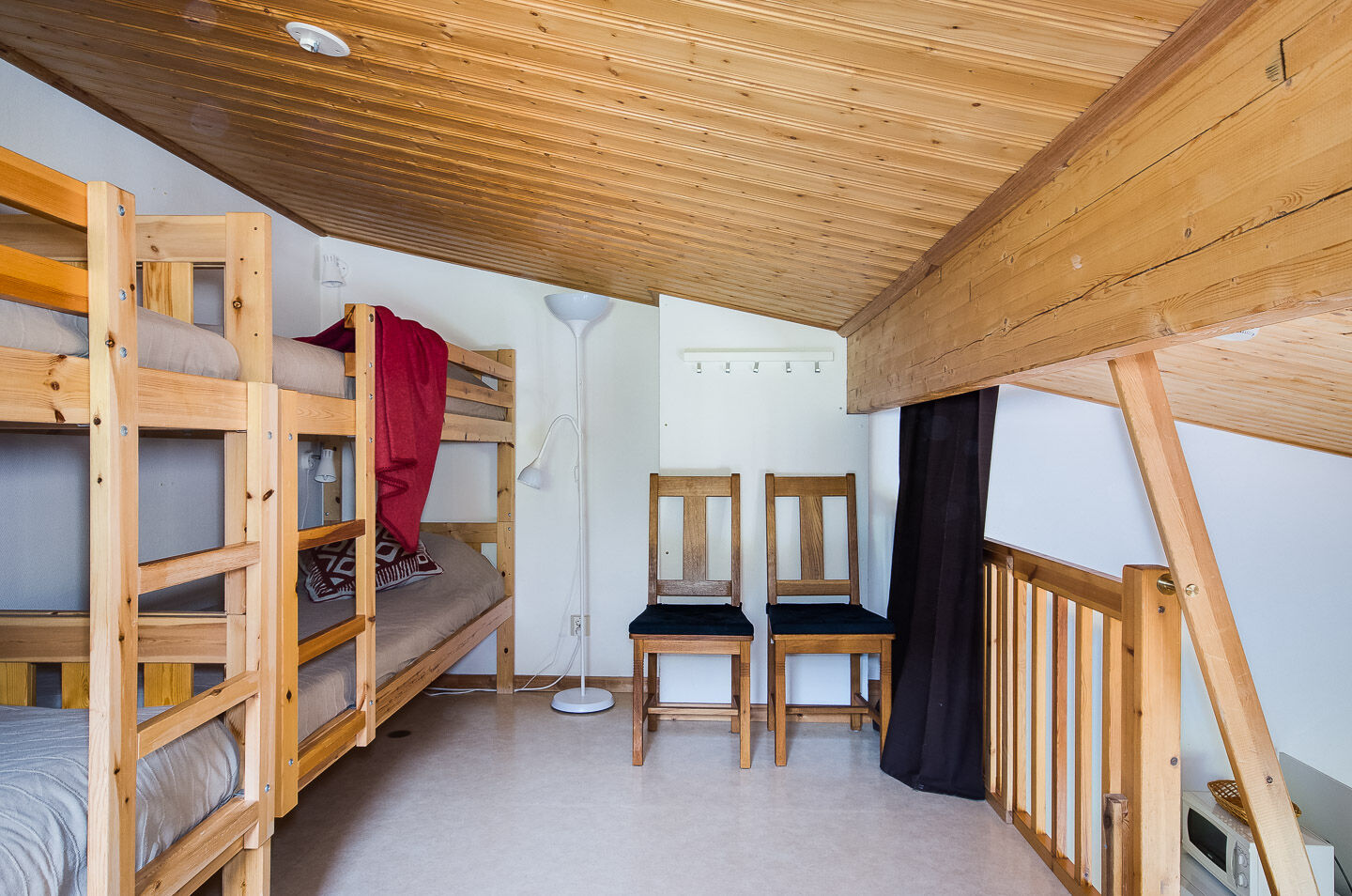 Sypialnia W apartamencie są dwie sypialnie, jedna z podwójnym łóżkiem, a druga z łóżkiem piętrowym. Na antresoli są dwie łóżka piętrowe, dostępne po drabinie.