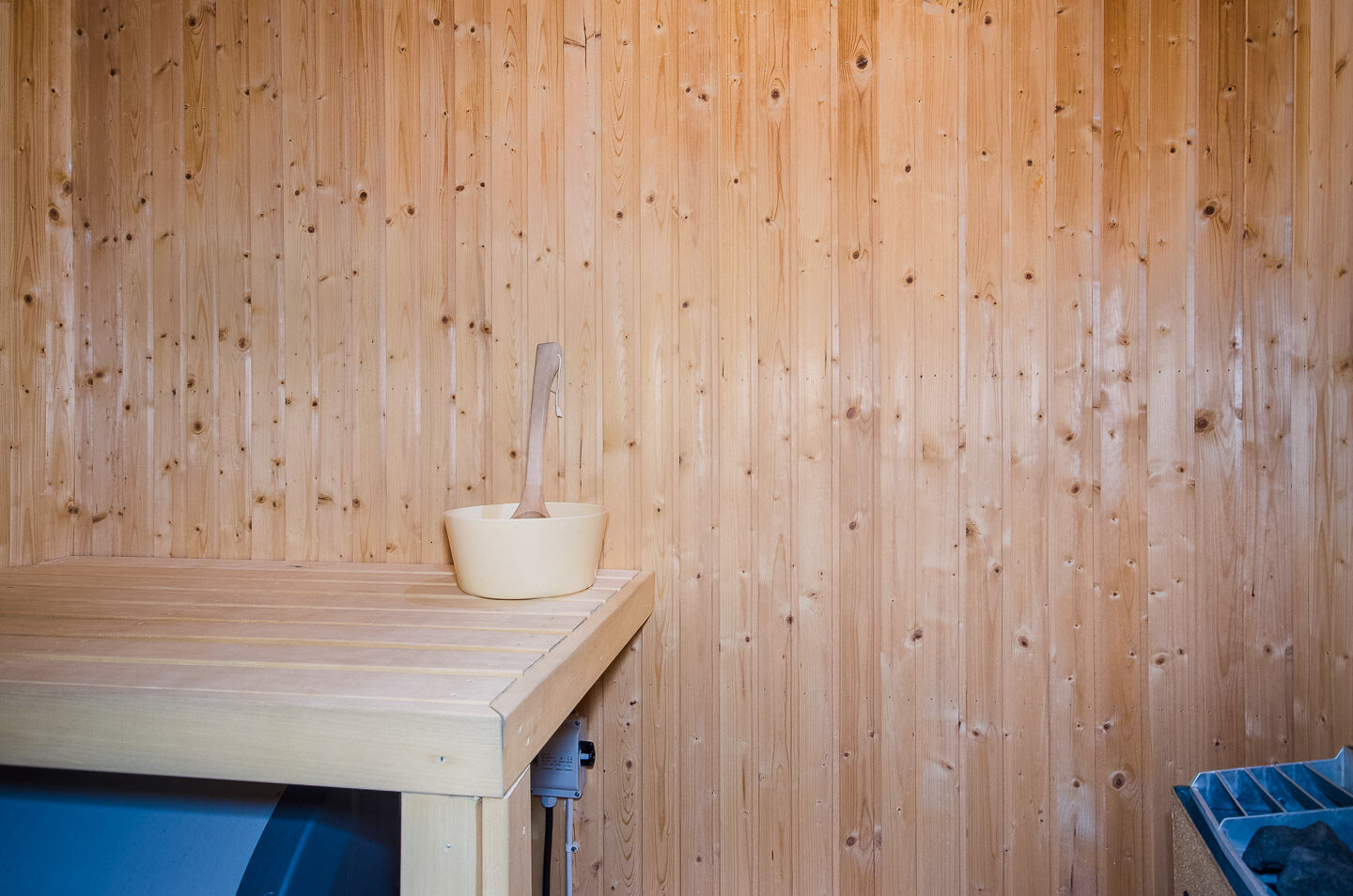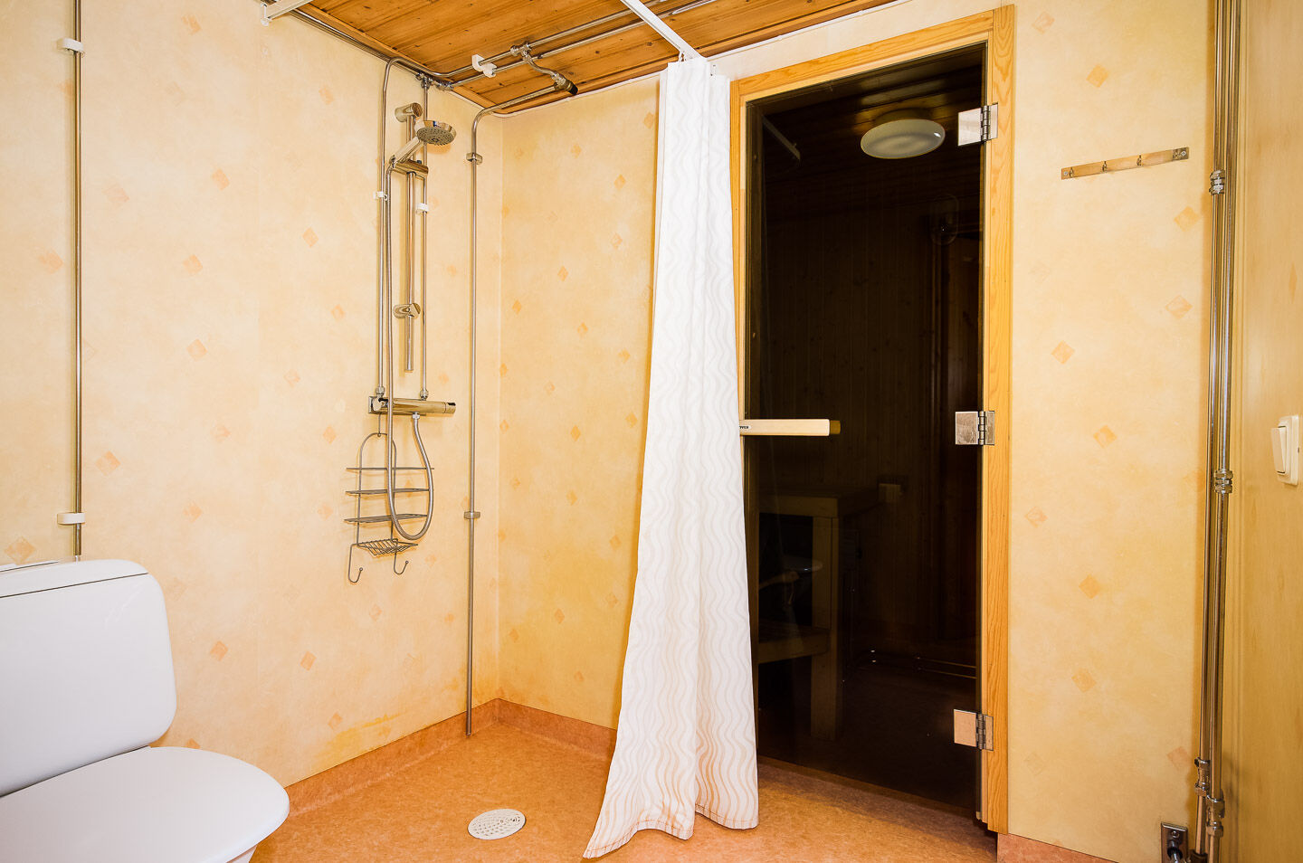 Łazienka Łazienka jest wyposażona w WC, prysznic i saunę.