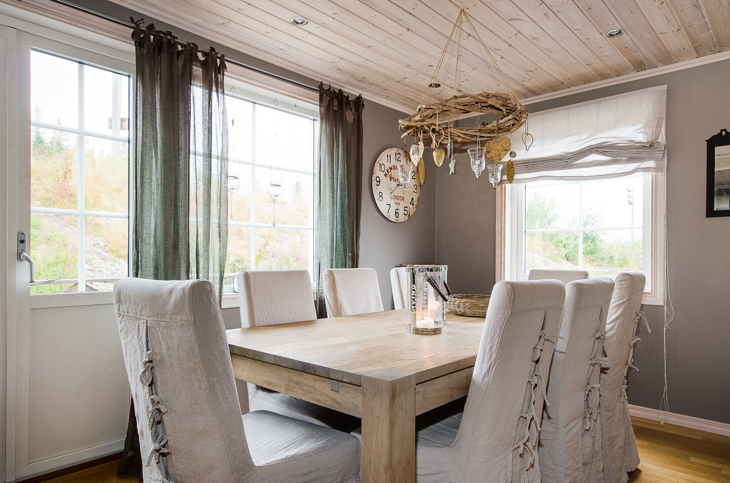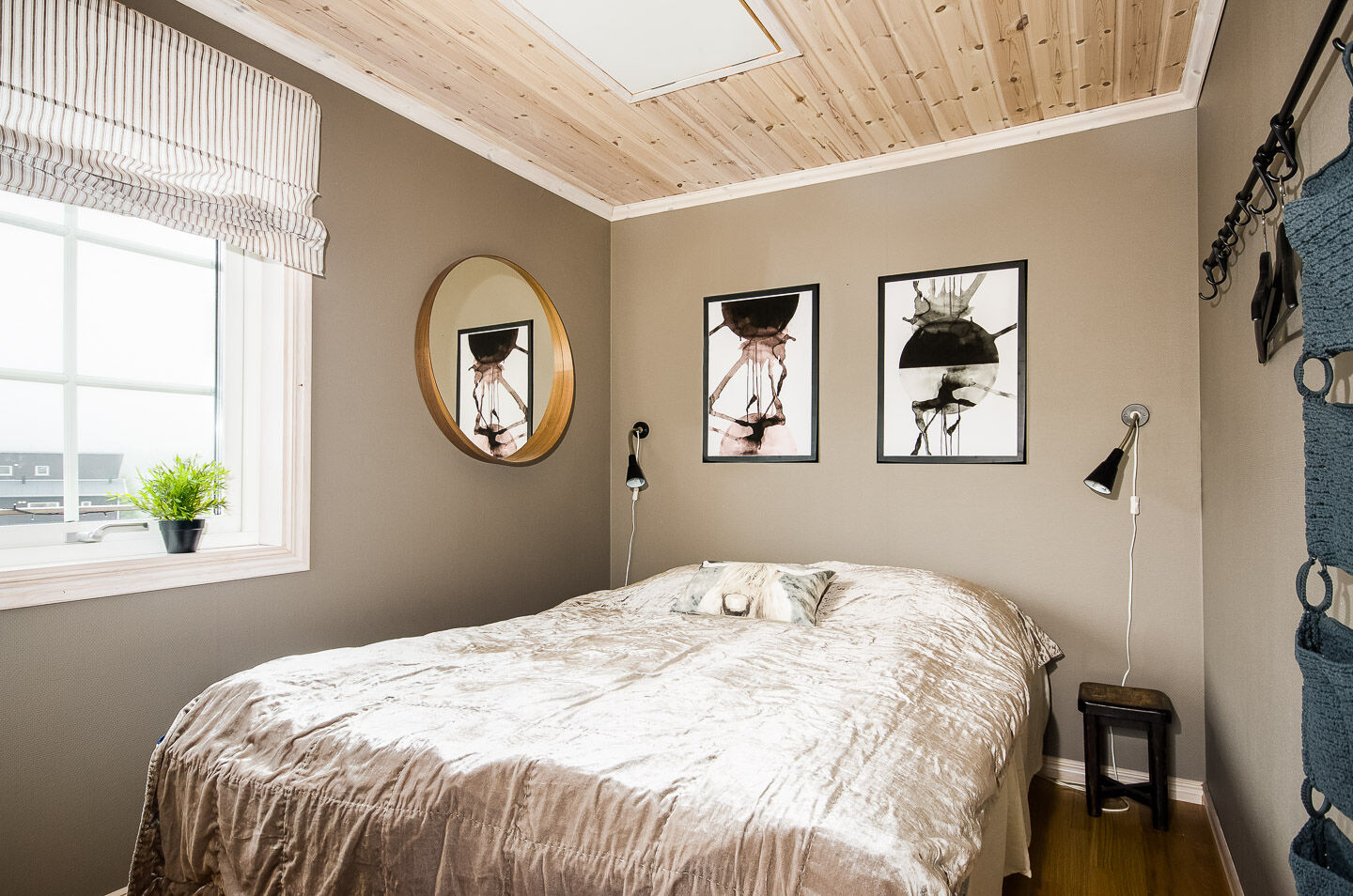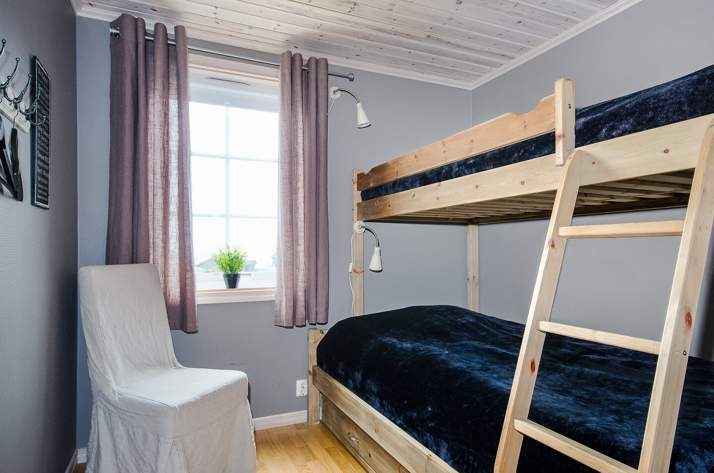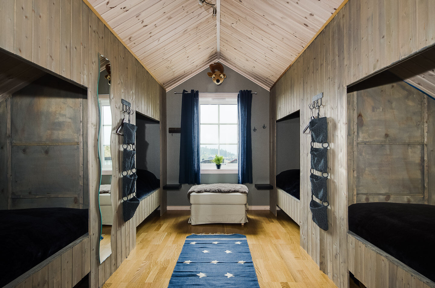 Sypialnie Na parterze znajdują się trzy sypialnie; dwie z podwójnymi łóżkami i jedna z łóżkiem piętrowym. Na poddaszu znajduje się sypialnia z czterema pojedynczymi łóżkami.