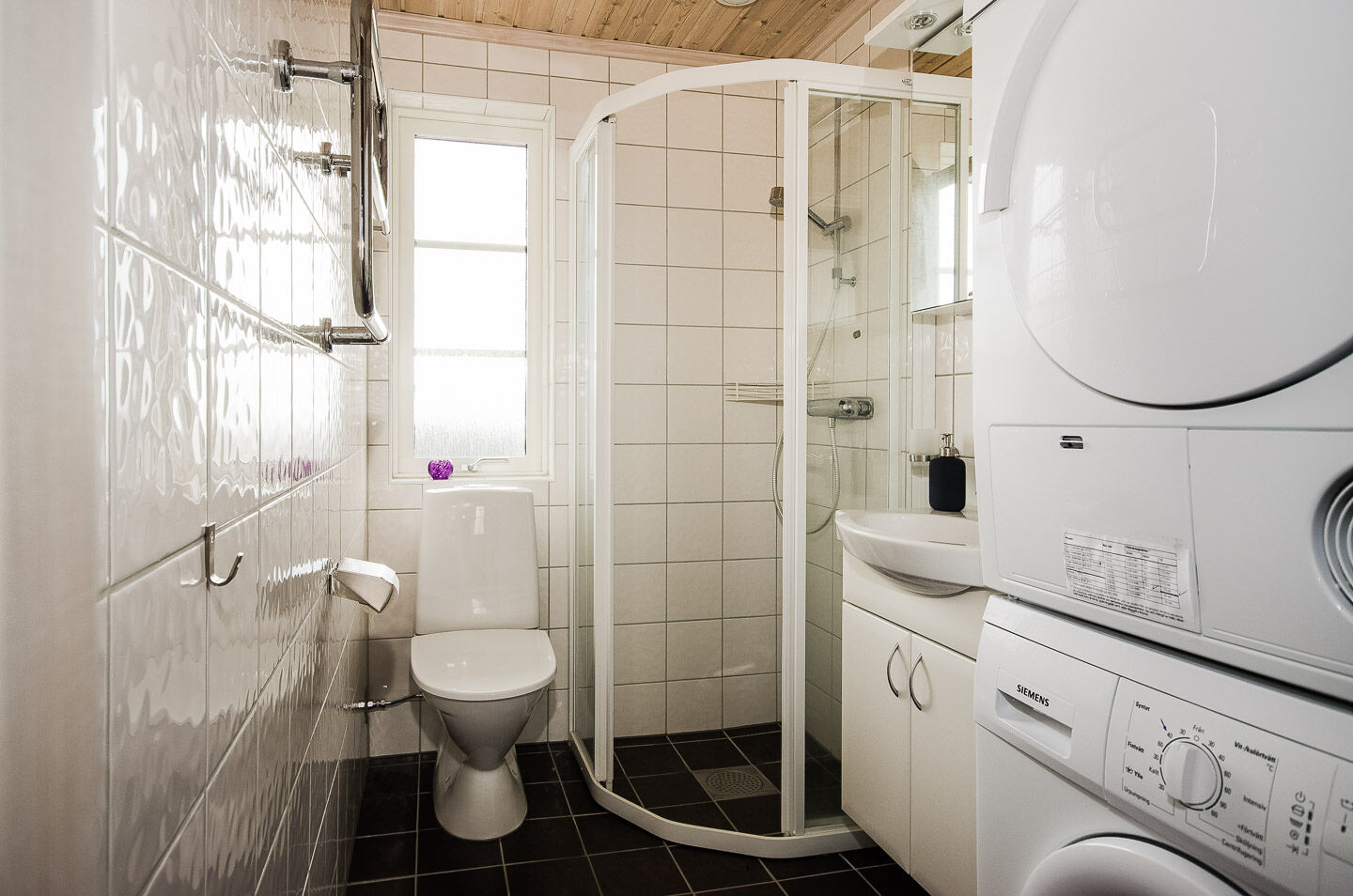 Łazienki W obiekcie znajdują się dwie łazienki z WC/prysznicem. W jednej z łazienek jest również sauna. Dostępne są pralka oraz suszarka do ubrań.