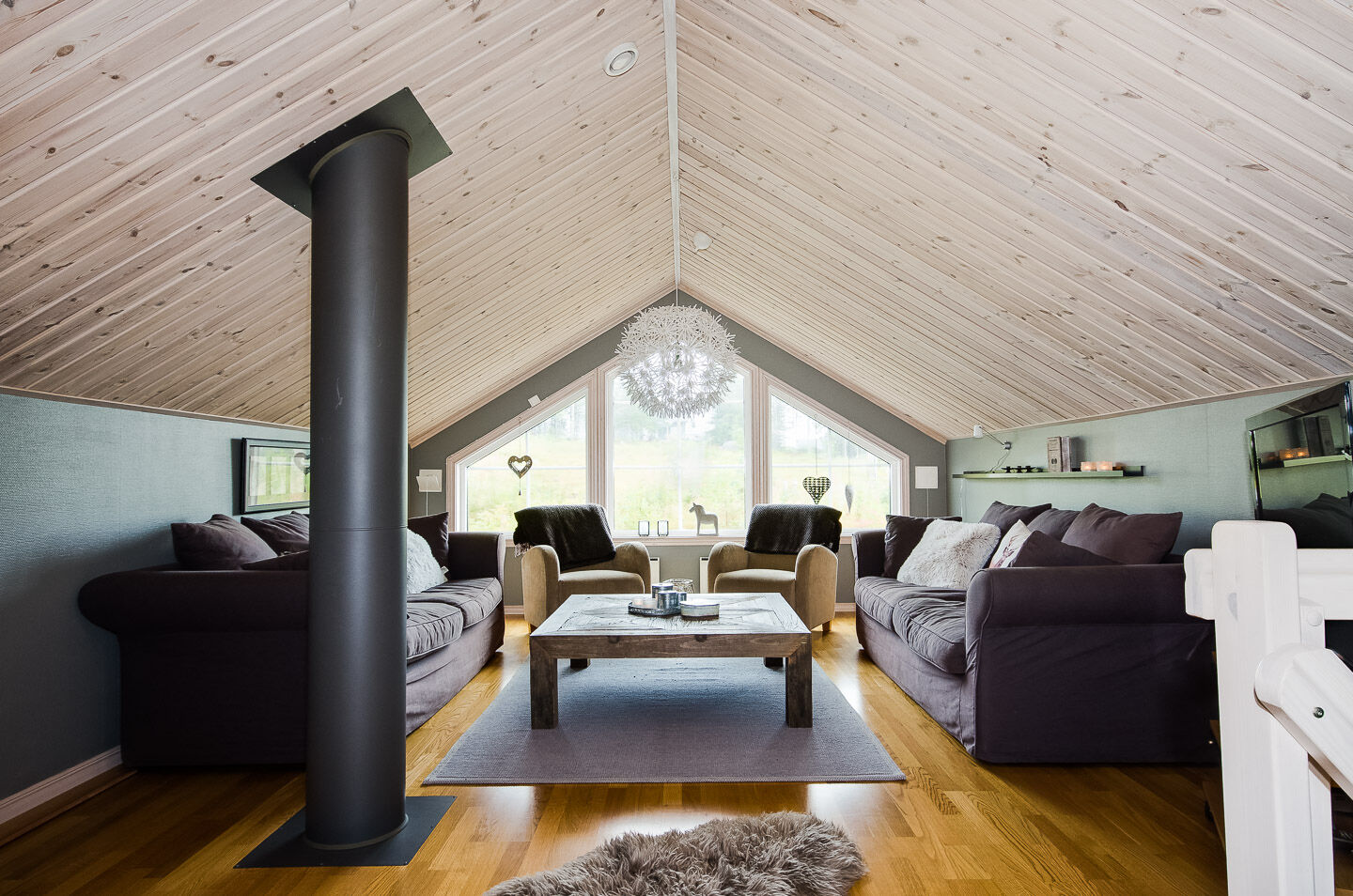 Salon Otwarty salon wyposażony jest w kominek, sofę, stolik kawowy i telewizor.