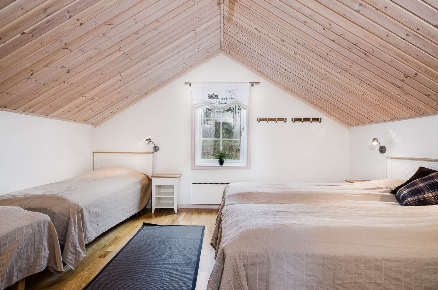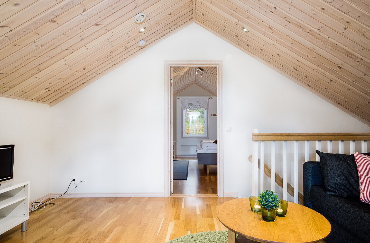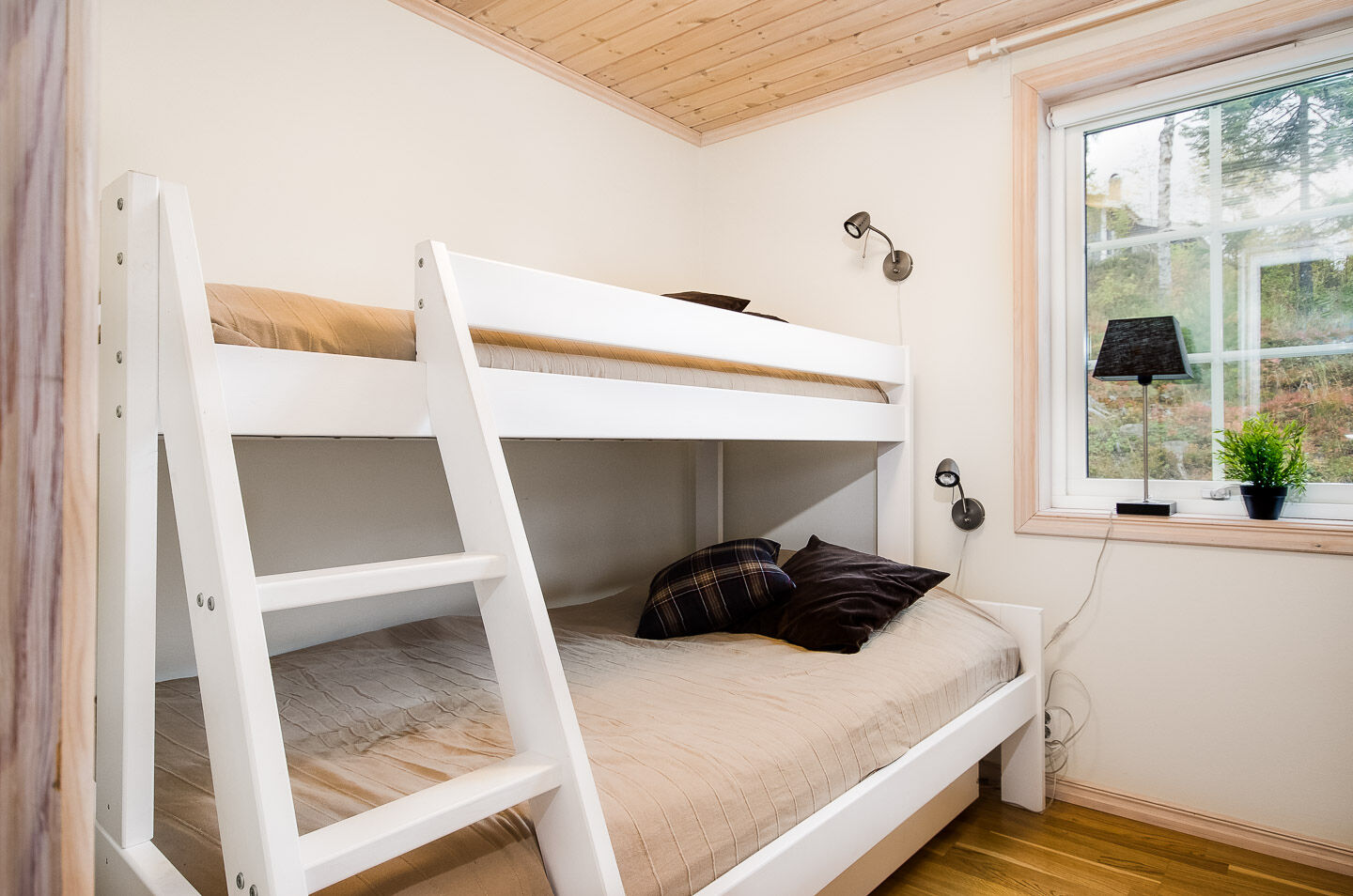 Na parterze znajdują się trzy sypialnie; jedna z łóżkiem podwójnym i dwie z łóżkiem piętrowym w każdym. Na poddaszu dwie sypialnie, w jednej cztery łóżka pojedyncze, w drugiej dwa. Sofa z dwoma dodatkowymi miejscami do spania również na poddaszu.
