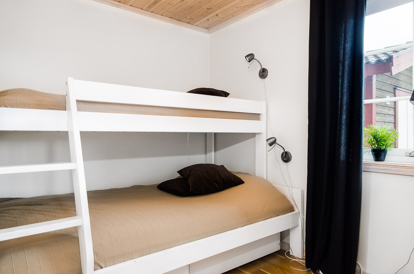 Stylowo urządzone domki z przestronnym salonem i kuchnią, wygodne sypialnie oraz kominek. Obiekt ma 120 m² i oferuje 12 miejsc noclegowych w pięciu sypialniach. Dodatkowo, dwa miejsca do spania na sofie na poddaszu. Dostępne są 2 WC/prysznice oraz sauna.