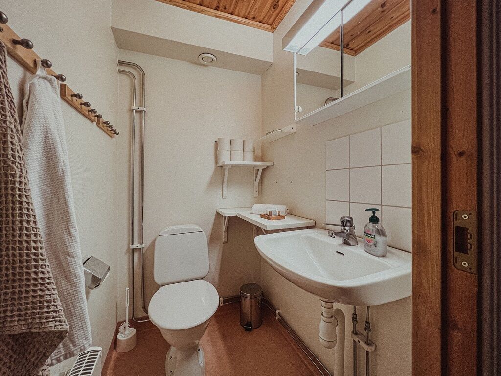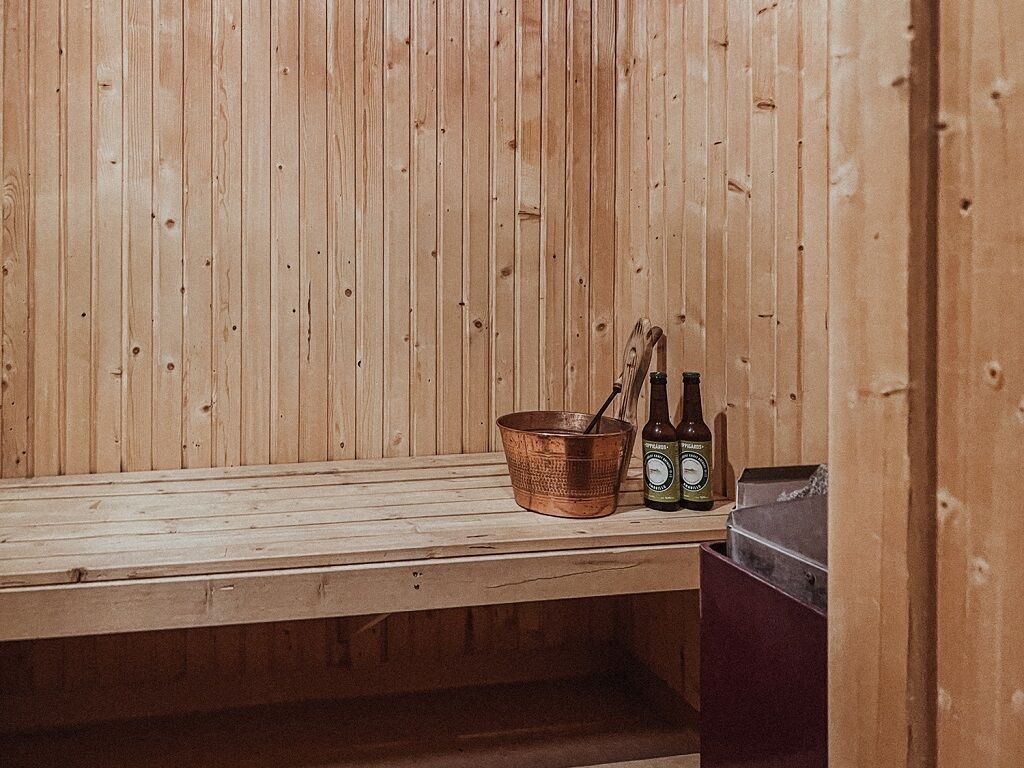 Łazienka wyposażona w WC, prysznic i saunę.