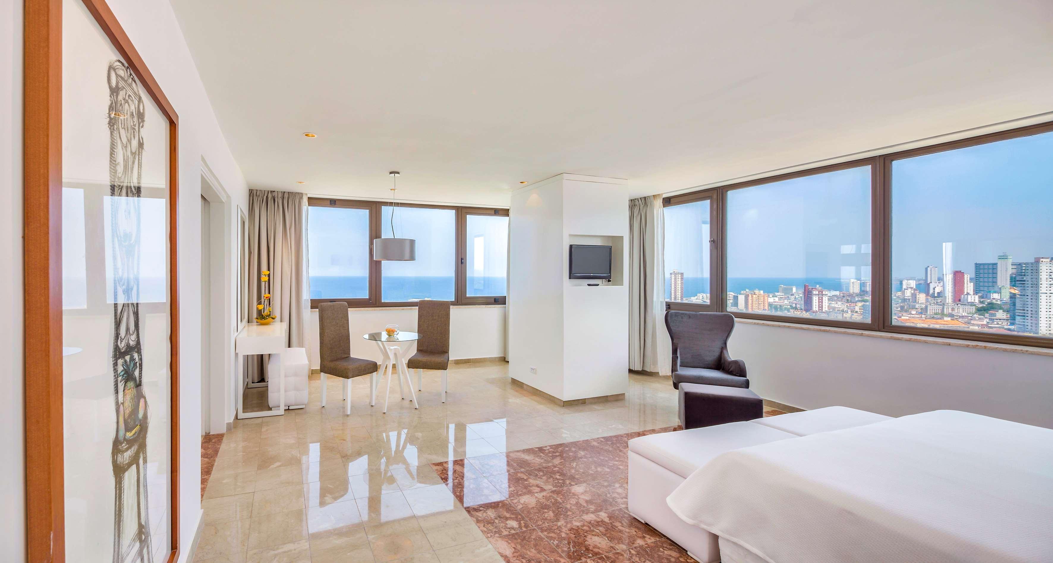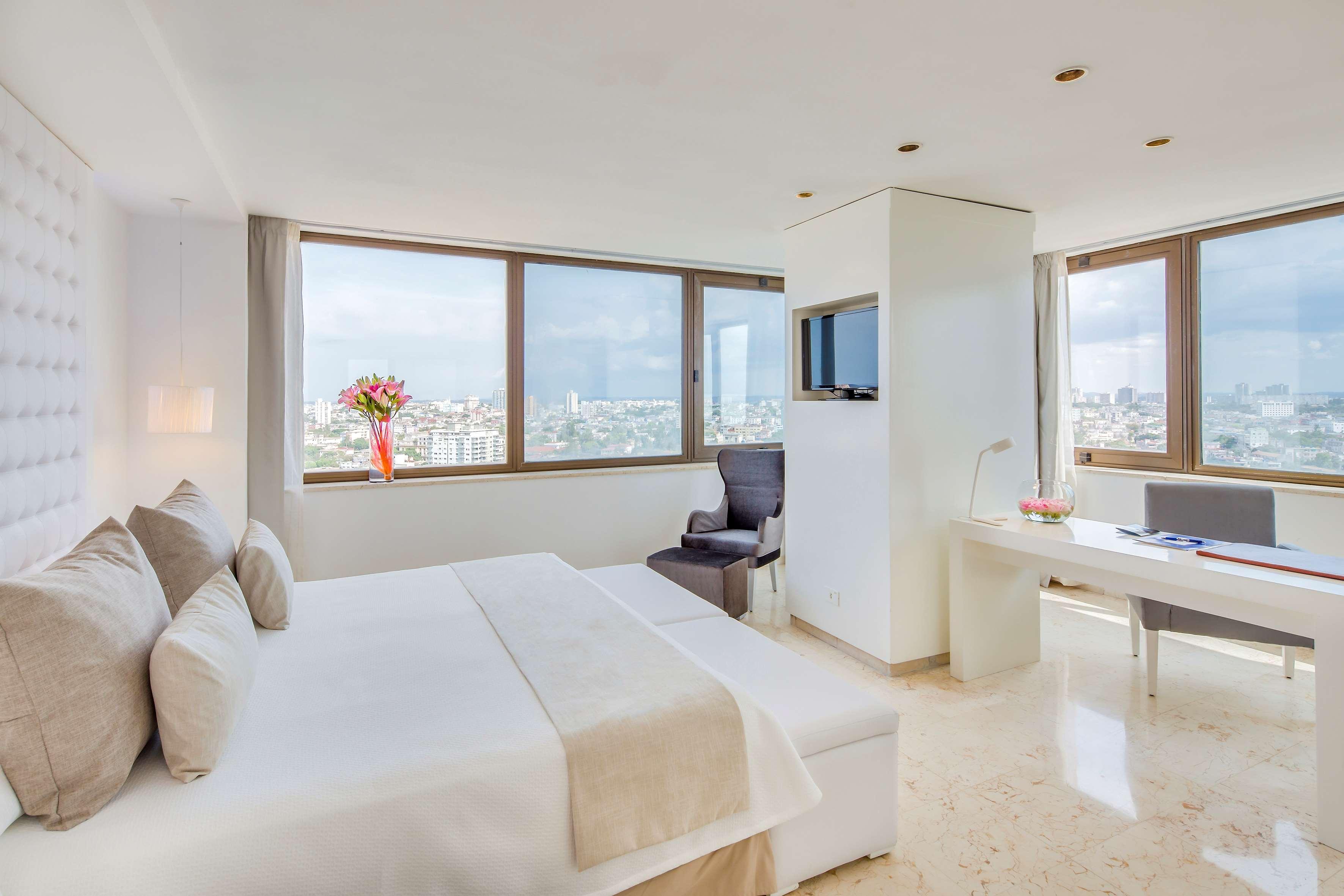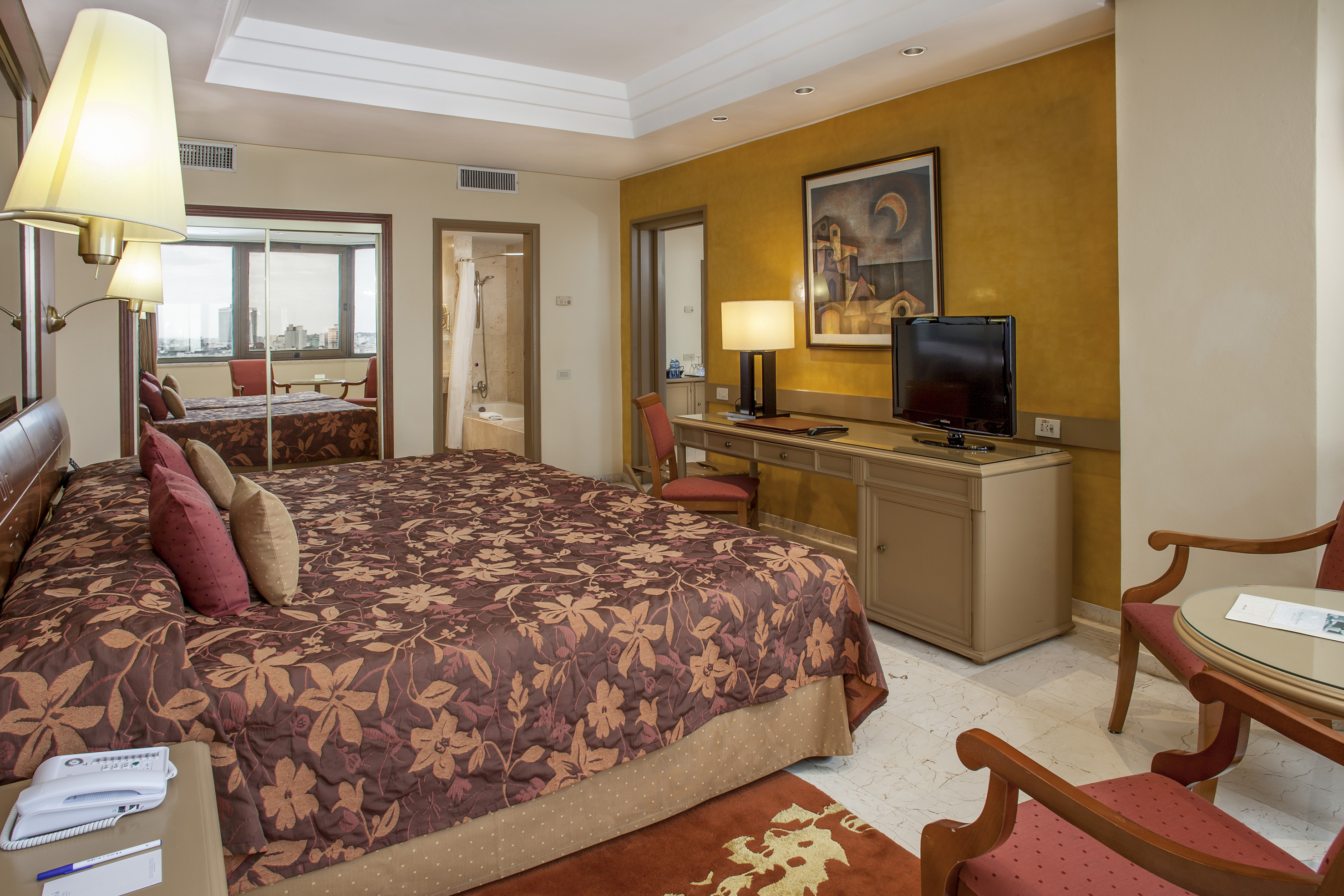 This hotel is situated in the centre of Havana, near Malecon. Just few kilometres away guests can find Revolution Square, the Old Town and the Botanic Gardens. Pabexpo is in around 11 km and the nearest beach is 25 km away. This luxury hotel offers a safe, shops and a café. Further facilities in the air-conditioned establishment include 5 bars, a nightclub and 5 restaurants. Conference facilities and public Internet access are also on offer. The air-conditioned rooms all come with an en suite bathroom and well-equipped living area. Further amenities include a minibar, a double or king-size bed and a breakfast table with chairs in the rooms. Guests are also offered a swimming pool, a hot tub and a sauna. Sports options include squash, aerobics and a gym. In the buffet restaurant Plaza Habana guests can enjoy breakfast, lunch and dinner with international dishes.