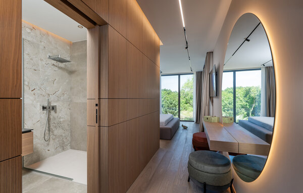 Pozwól się oczarować przestronnym terenem zewnętrznym z luksusowym basenem i zapierającymi dech w piersiach widokami na przyrodę. Zrelaksuj się na wygodnych leżakach, zanurz się w orzeźwiającej wodzie lub grilluj na tarasie. Zafunduj sobie kieliszek wina o zachodzie słońca lub nocną kąpiel w wannie z hydromasażem.